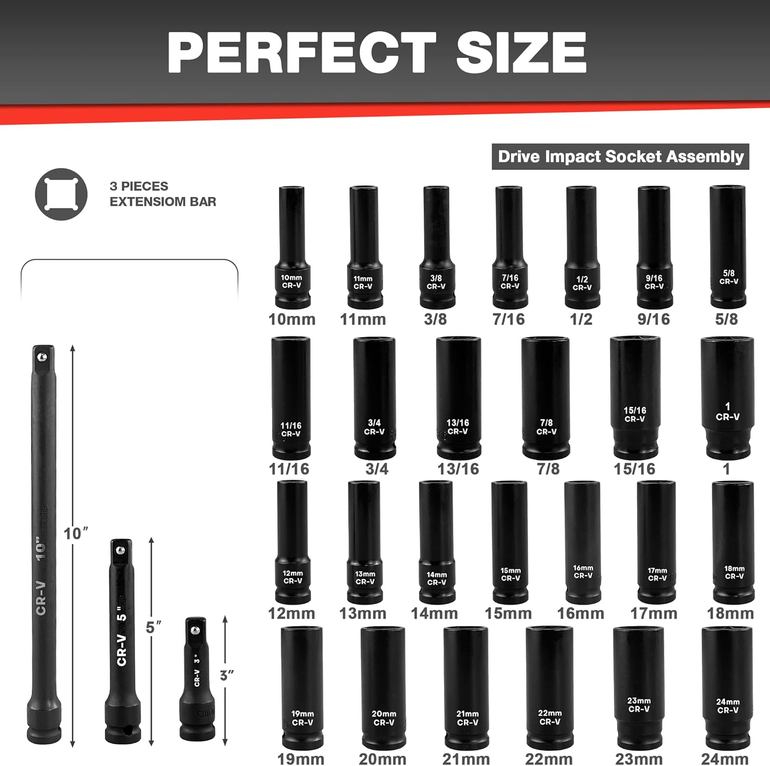 - 【Size Included】The 29pcs 1/2" socket sets include 3pcs extension bar: 3" ,5" 10". 11pcs sae socket sets: 3/8", 7/16", 1/2", 9/16", 5/8", 11/16", 3/4", 13/16", 7/8", 15/16", 1". 15pcs metric socket sets : 10-24mm. Totally 29pcs.