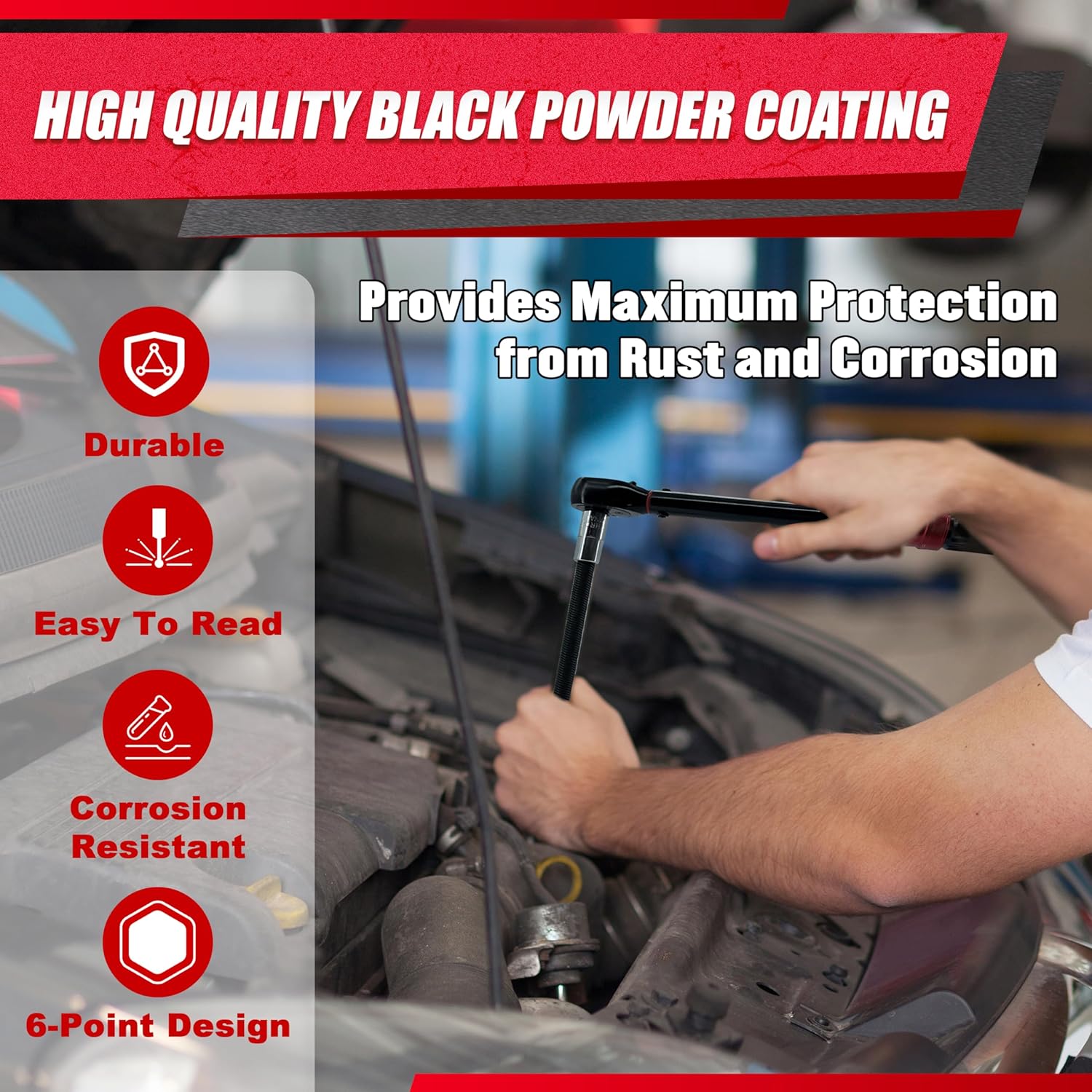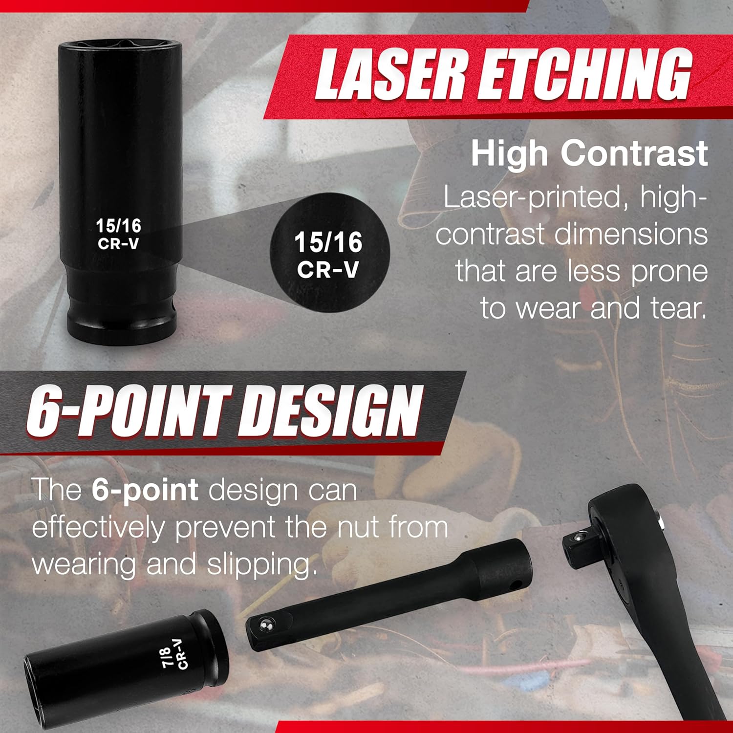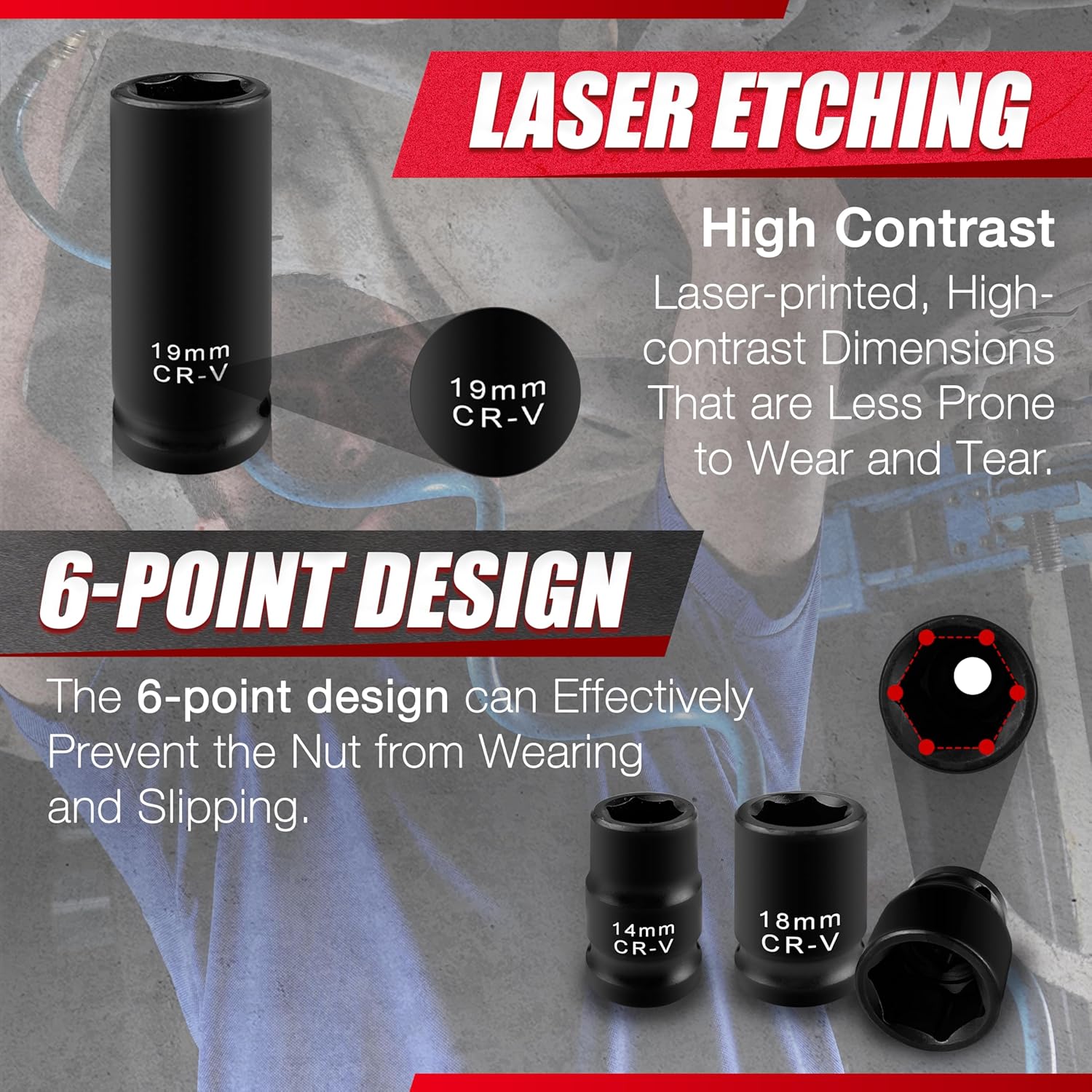 - 【Advantages】 The dimensions on the socket are all high-contrast dimensions of laser printing, which are not easy to wear out and can be seen clearly in low light.It is convenient for you to work at night.The sockets are precisely dimensioned for use in all types of automotive or mechanical equipment.The 6-point design can effectively prevent the nut from wearing and slipping.