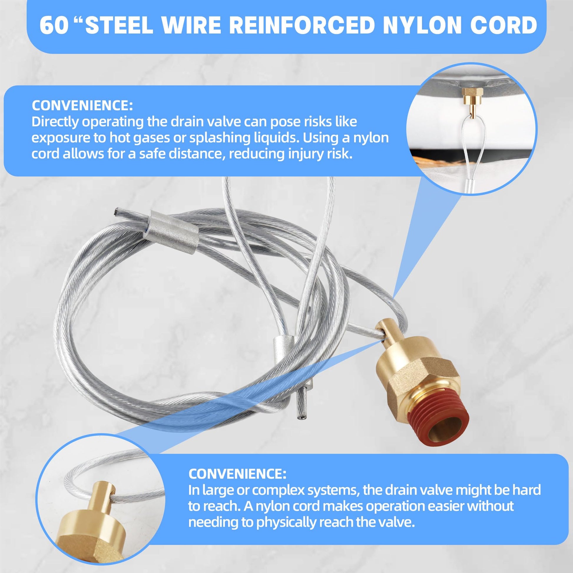 - 【Why Choose Us?】This 3/8" male NPT compressed air tank cable-style pull drain replaces a twist-style petcock for releasing moisture from the tank. It screws into the tank bottom where the petcock was, and the cable mounts to the tank base or another accessible spot for easy pulling. No need to crawl under the tank, just pull the cable to release moisture.