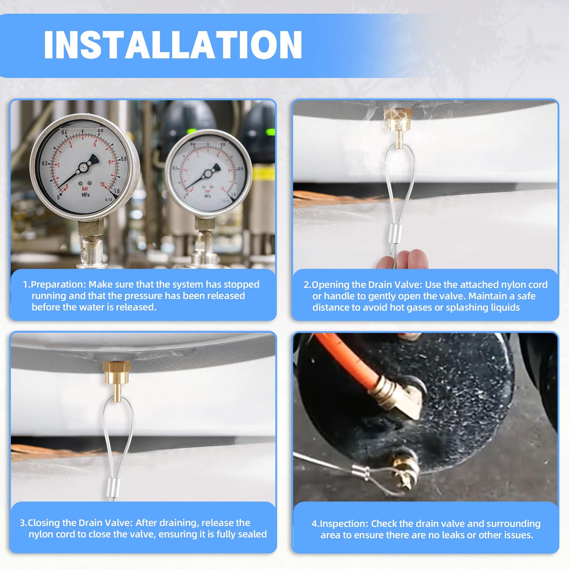 - 【Heavy-duty Brass Construction】Crafted from premium brass, the air tank drain valve fitting kit boasts robustness with thicker and stronger components. The material's durability is complemented by deep and precise threads, ensuring a reliable and secure fit. Notably, the brass exhibits high corrosion resistance, reducing the impact of environmental factors.