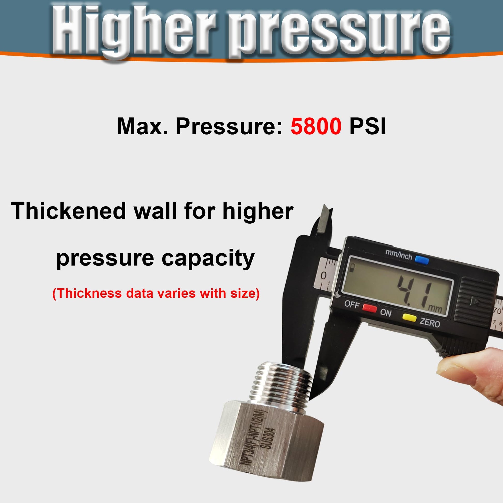 - FEMALE TO MALE REDUCER ADAPTER: 3/8 inch female thread has 0.56"-0.59" inner diameter(ID) and connect to 0.63"-0.65" outer diameter(OD) pipe thread. 1/4 inch male thread has 0.5"-0.53"outer diameter(OD) and connect to 0.45"-0.47" inner diameter(ID) female pipe thread. 1/4 NPT male X 3/8 NPT female thread pipe fitting connector. Max Pressure: 5600psi, Working Temperature Range: -50℃~+500℃/-58℉~+932℉.