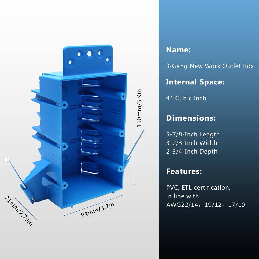 - 【Different Needs】Outlet Box 3 Gang 44 cu-in 3G New Work Nail On Box is very suitable for new construction projects and home upgrades, and is an ideal choice for decoration. It can be applied to various drywall thicknesses and wall finishes, suitable for various installation and renovation needs