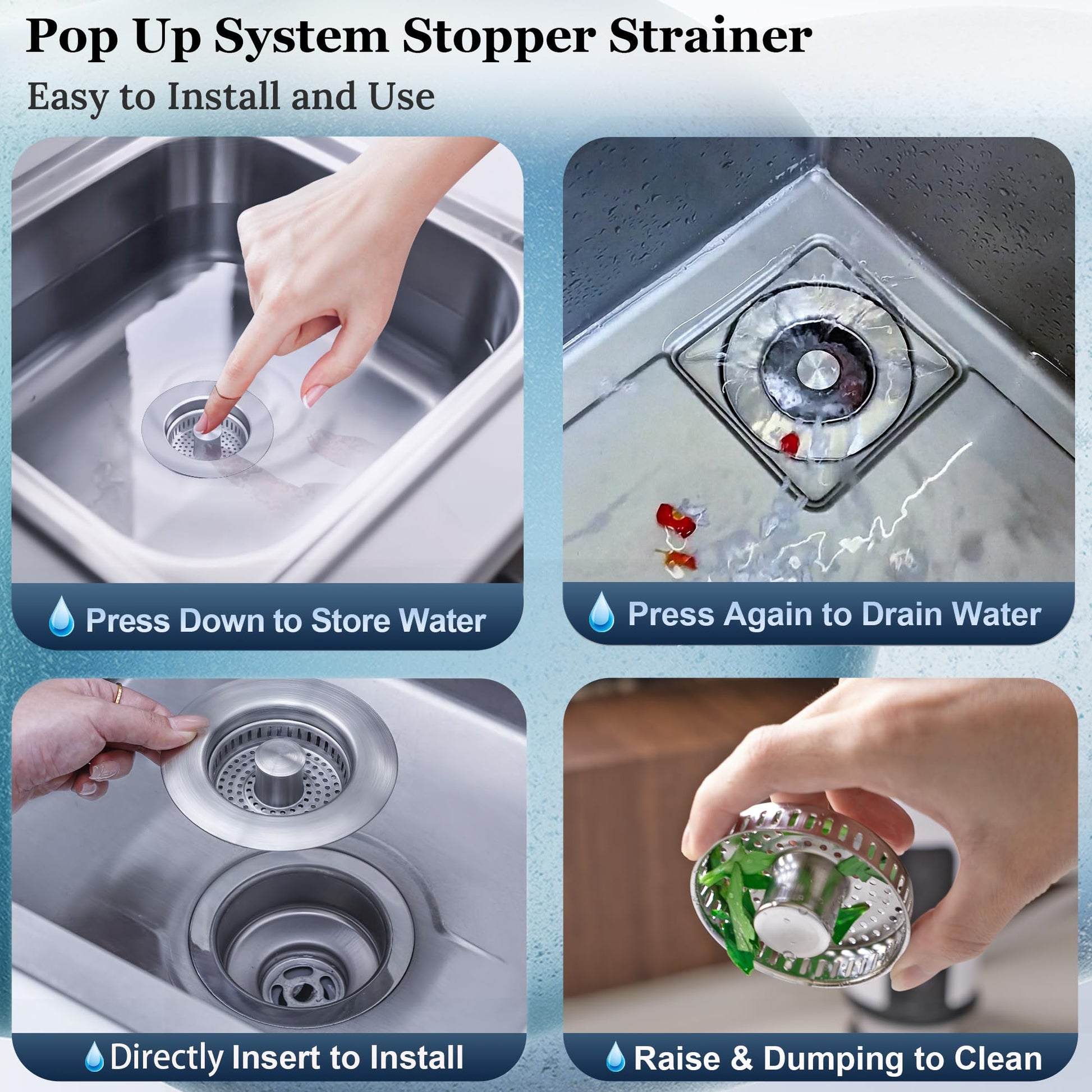 - Easily Installation and Operation Sink Stopper for Kitchen Drain: Remove you old drain stopper and place our upgraded kitchen sink drain stopper onto your drain, press the pop up cap to store water and press again to drain water while catching debris.Then pick up the portable basket to clean residue.The whole process is a piece of cake.