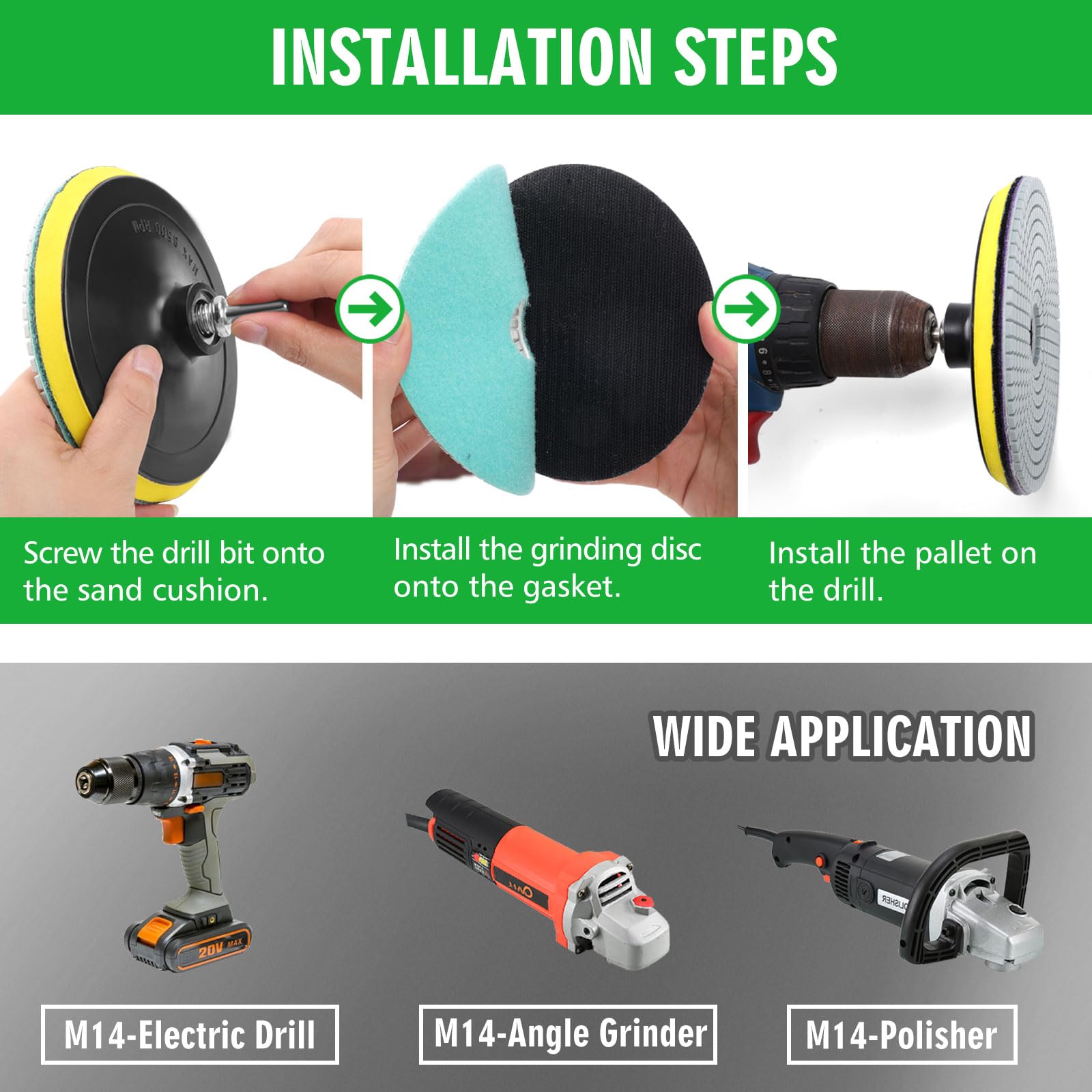 - GREAT VALUE 12PCS MARBLE POLISHING KIT: The stone polishing kit include 8pcs assort grit diamond polishing pads (50#,100#,200#,400#,800#,1500#,3000#,6000#), 2 wool felt polishing pad, 1pc M14 thread hook and loop backer pad and 8mm drill adapter