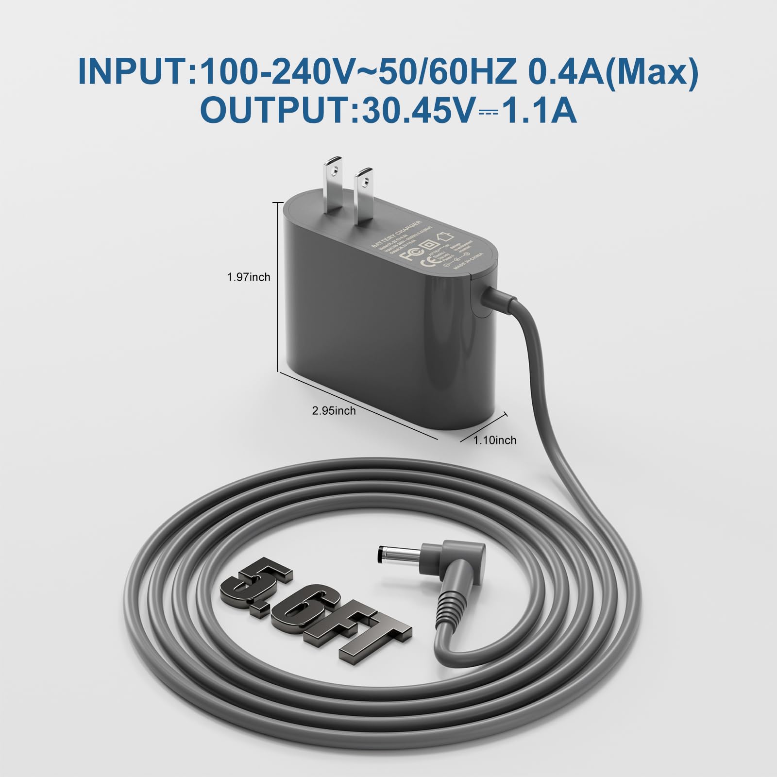 - Input: AC 100-240V, 50/60Hz; Output: 30.45V 1.1A Connector: DC 4.8 x 1.7mm Product Size: 2.95×1.1×1.97in (7.5×2.8×5cm) , AC Power Cable 5.6 FT(170cm)