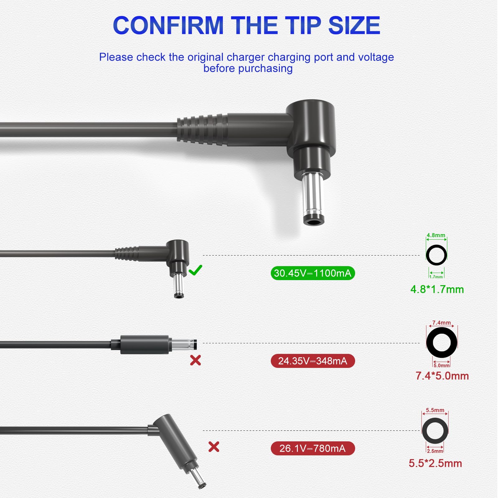 - Input: Auto-Switching 100-240V 50/60Hz 0.4A(Max),So This can be used worldwide; Output: 30.45V 1.1A(1100mA); Connector Size: Round Connector 4.8 mm x 1.7 mm