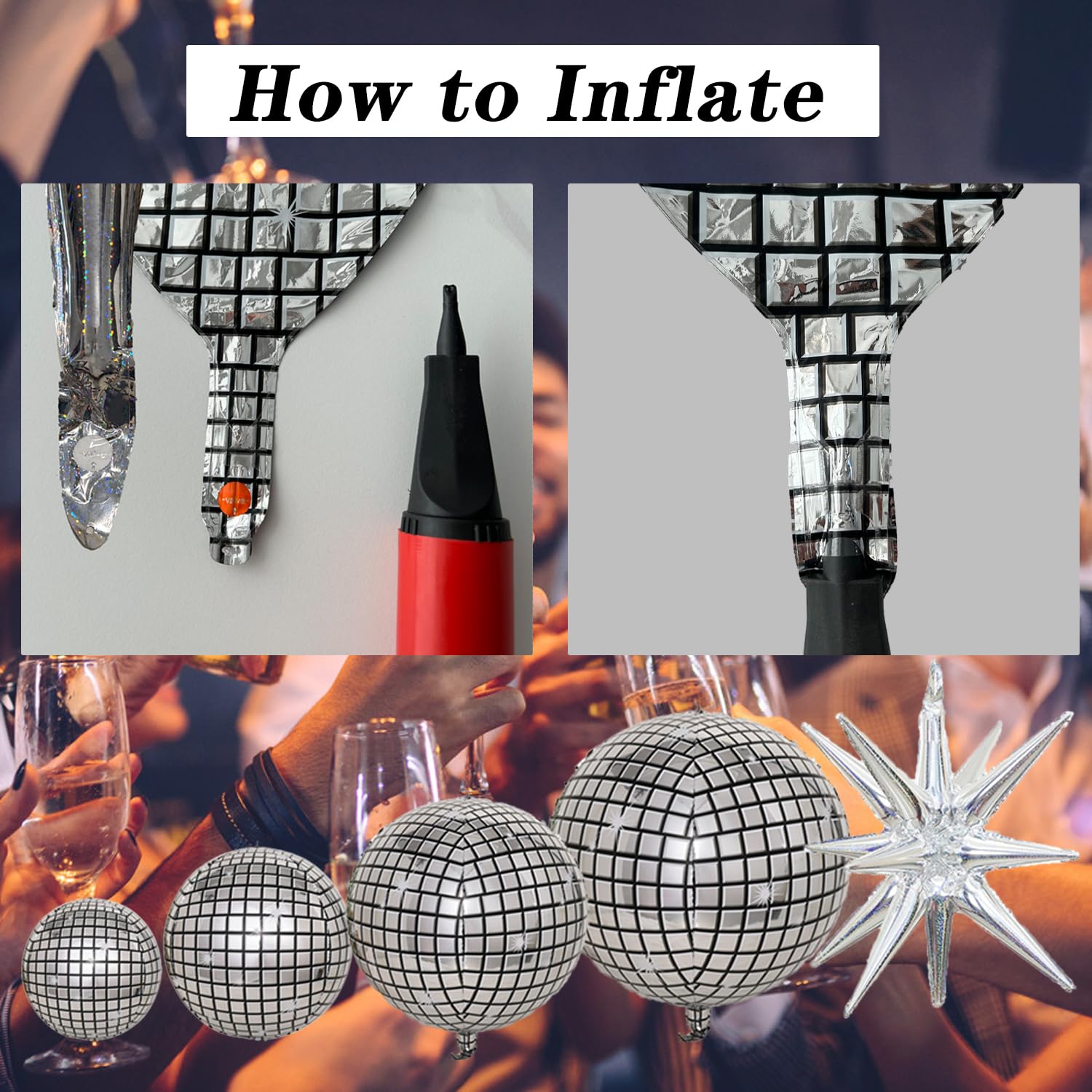 - Easy to Use: Our unique disco foil balloons are very easy to use, find the filling tab, insert the pump or straw and fill it with air, automatically seal, no need to tie, and not easy to leak.
