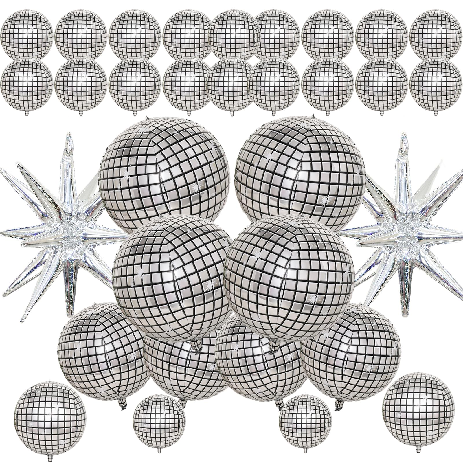 30 Pcs Disco Ball Balloons,4D Large Foil Balloons with Metallic Star,Huge Silver Explosion Star Aluminum for Disco Dance Birthday Party Graduation New Year Decoration