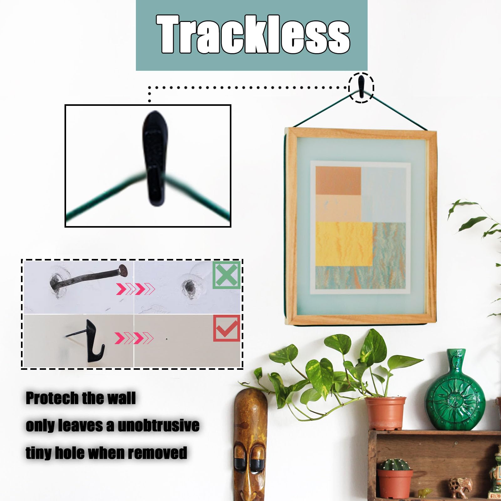 2.No Damage Wall Picture Hangers: When removed, our trackless wall tacks leave only a small nail hole. You don't worry damage the wall or Affect the beauty of the entire house.