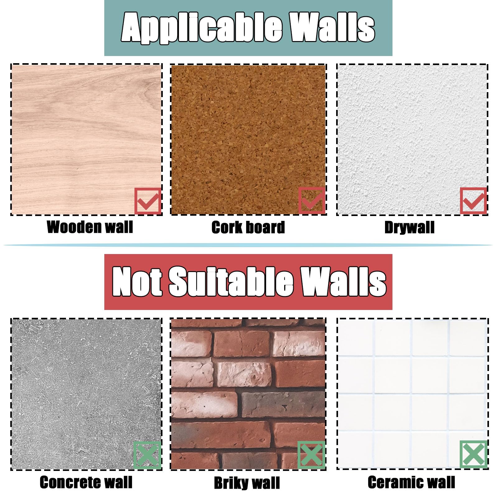 2.The features of chosen wall couldn't be extreme hard or soft, corkboard, drywall, plaster wall were the most ideal platform.