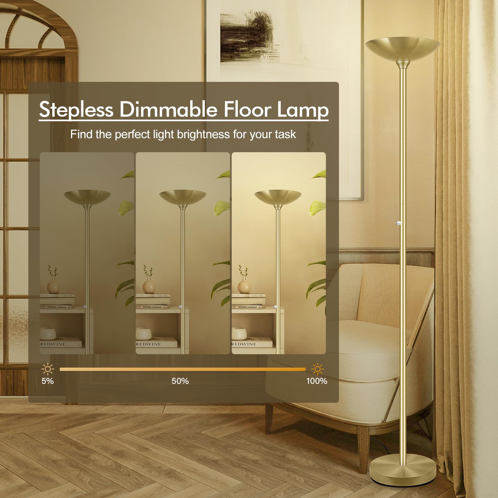 30W Torchiere Floor Lamp Gold, 3600LM Bright Stepless Dimmable Floor Lamp, 71 Inch LED Standing Lamp 3000K, Rotary Switch, I Inch Thick Pole, Tall Metal Torch Floor lamps for Living Room/Bedroom/Den