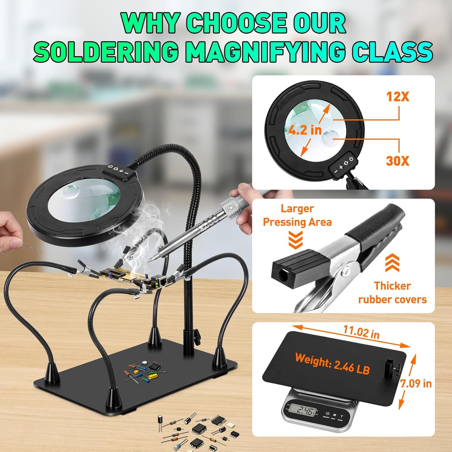 - 【12X & 30X LED Magnifying Lamp】With its 12X & 30X magnification and 4.2-inch real glass lens, our magnifier lens offers clear and detailed visibility without edge distortion, making it ideal for repairing circuit boards, soldering, figurine model painting, crafting, jewelry, hobby work or even reading fine print