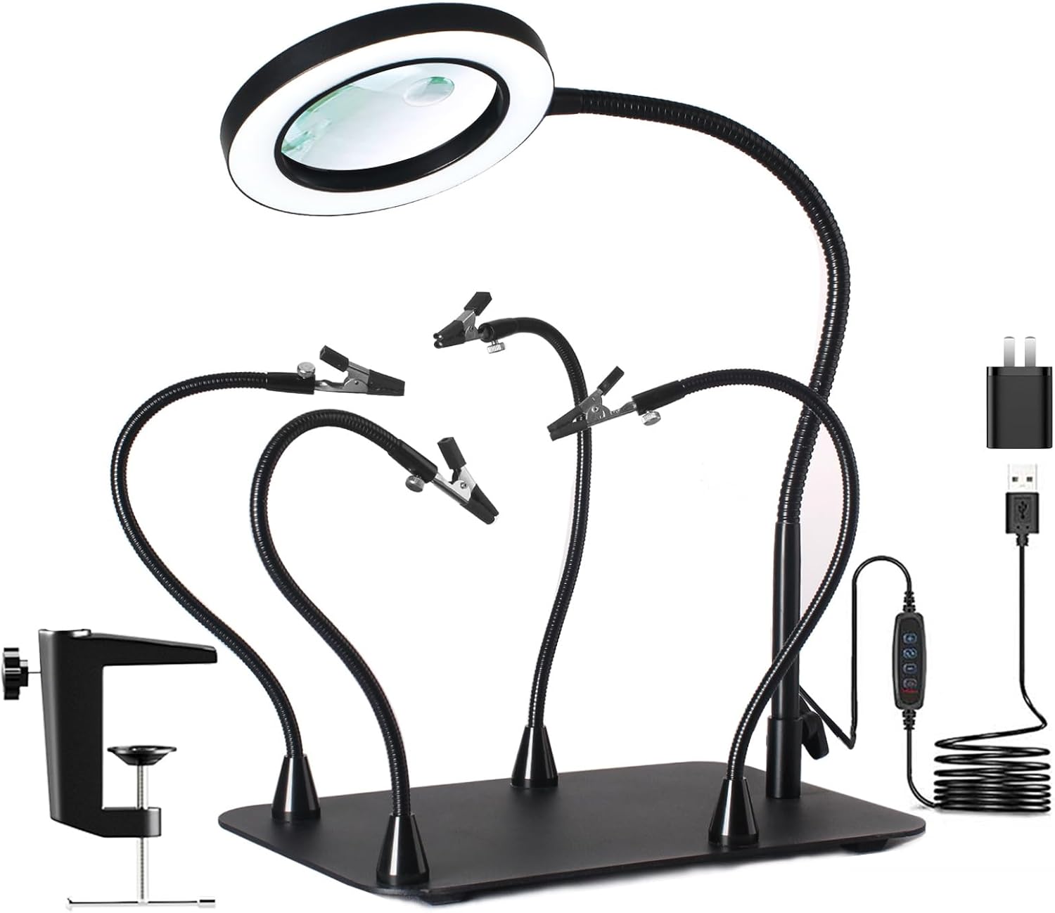 - 【Package Included】 1* Rectangular Metal Base; 1* Metal Clamp; 1* 12X & 30X Magnifying Lamp;4* Magnetic Gooseneck Arms; 5* Alligator Clips; 1* Adapter; 1* User Manual. lf you have problems, please contact us, we will try our best to help you solve the problem