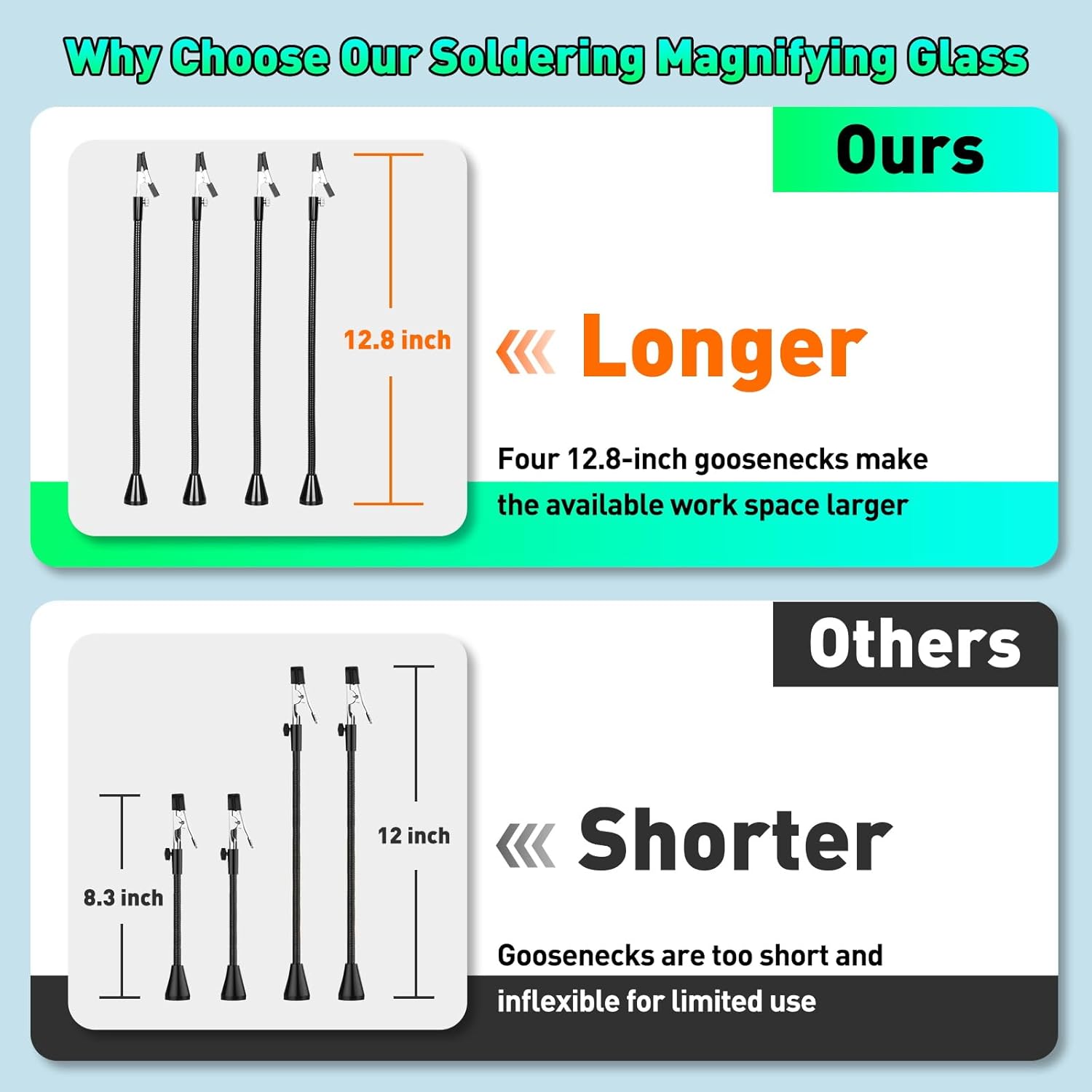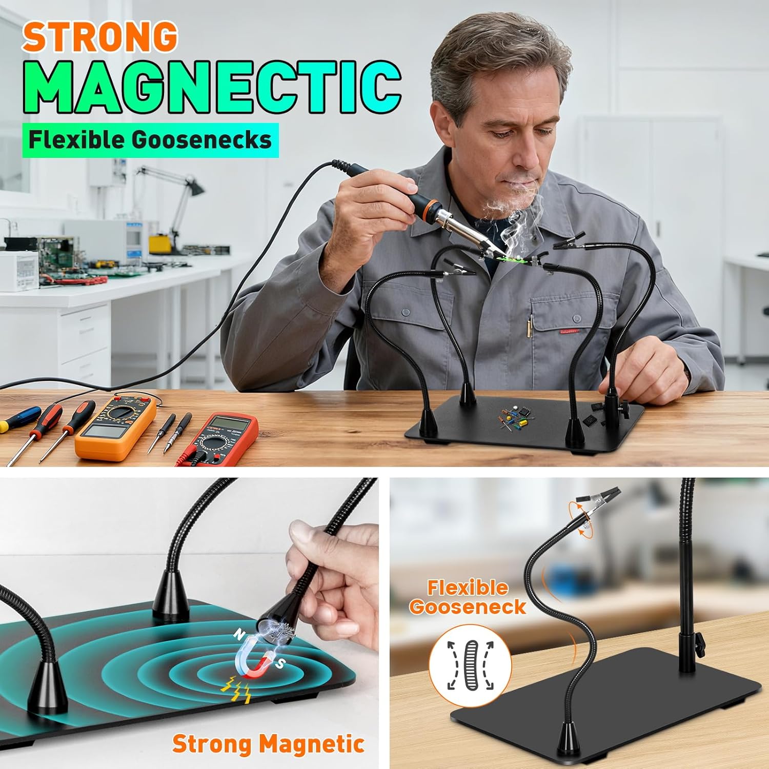 - 【4 Flexible Magnetic Helping hands】No more complicated screws! Easy to install. Four long 13-inch flexible magnetic Helping Hands can be your third hand to help you safely position PCB circuit boards, assembly, repair, crafts, hobby or jewelry for precise work, freeing up your hands. The soldering magnifier is a gooseneck design with 360° flexible adjustment and a super magnetic bottom that allows it to be placed anywhere on the base
