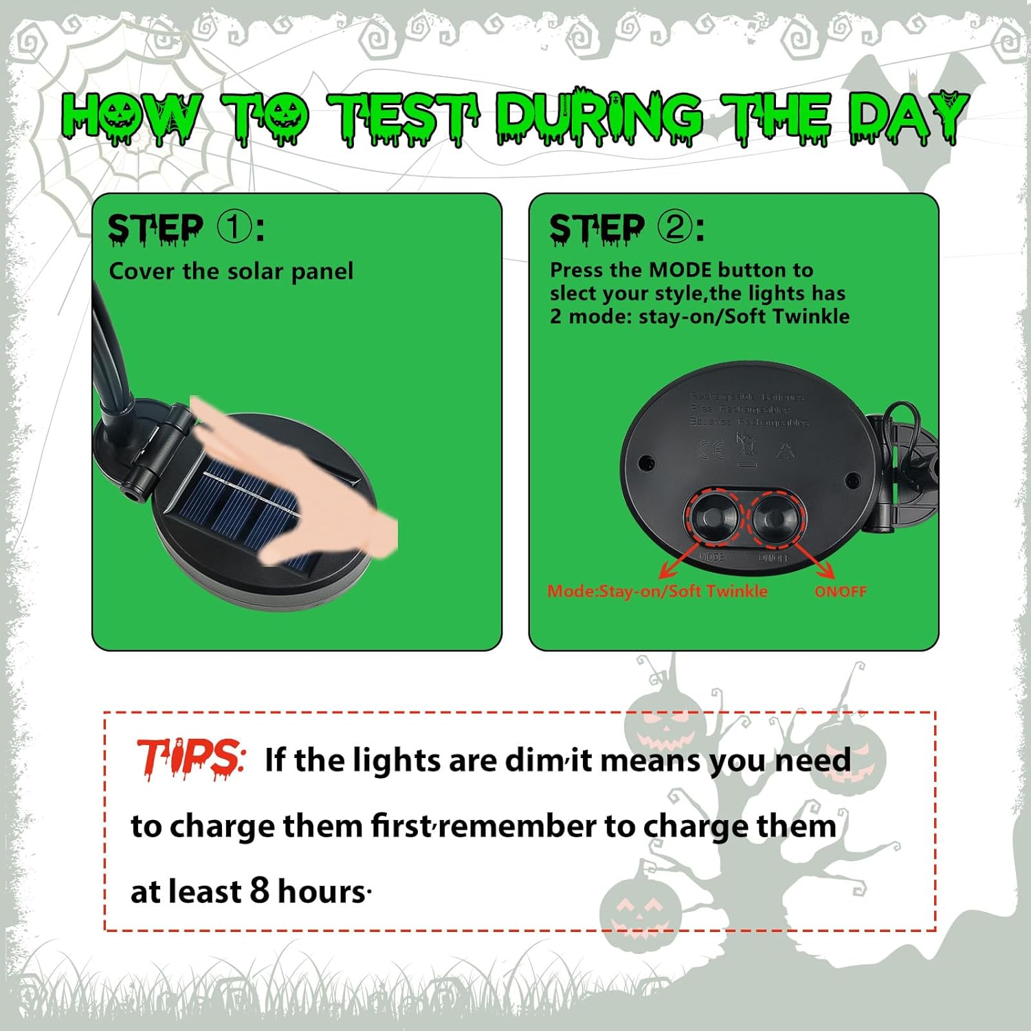 - Upgraded Two Lighting Modes: The outdoor Halloween solar lights have 2 lighting modes (Steady On and Soft Twinkling Mode) to meet your different outdoor Halloween decoration needs which can add a lot of vitality to your garden. The steady on mode can meet the needs of most people, the lights will steady on one color as long as it has power. The soft twinkling mode can breathe like fireflies, adds more spunk and mischief to Halloween!