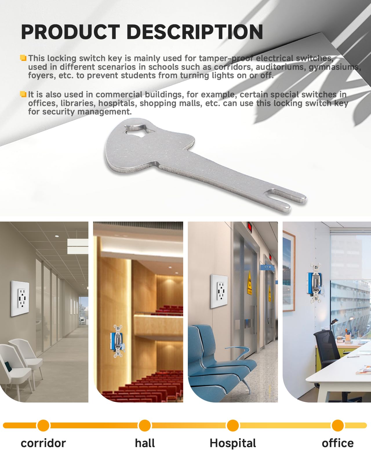 - Product Description: This locking switch key is mainly used for tamper-proof electrical switches, used in different scenes in schools such as corridors, auditoriums, gymnasiums, foyers, etc. to prevent students from turning on or off lights. It is also used in commercial buildings, for example: some special switches in scenes such as offices, libraries, hospitals, shopping malls, etc., can use this locking switch key for security management.