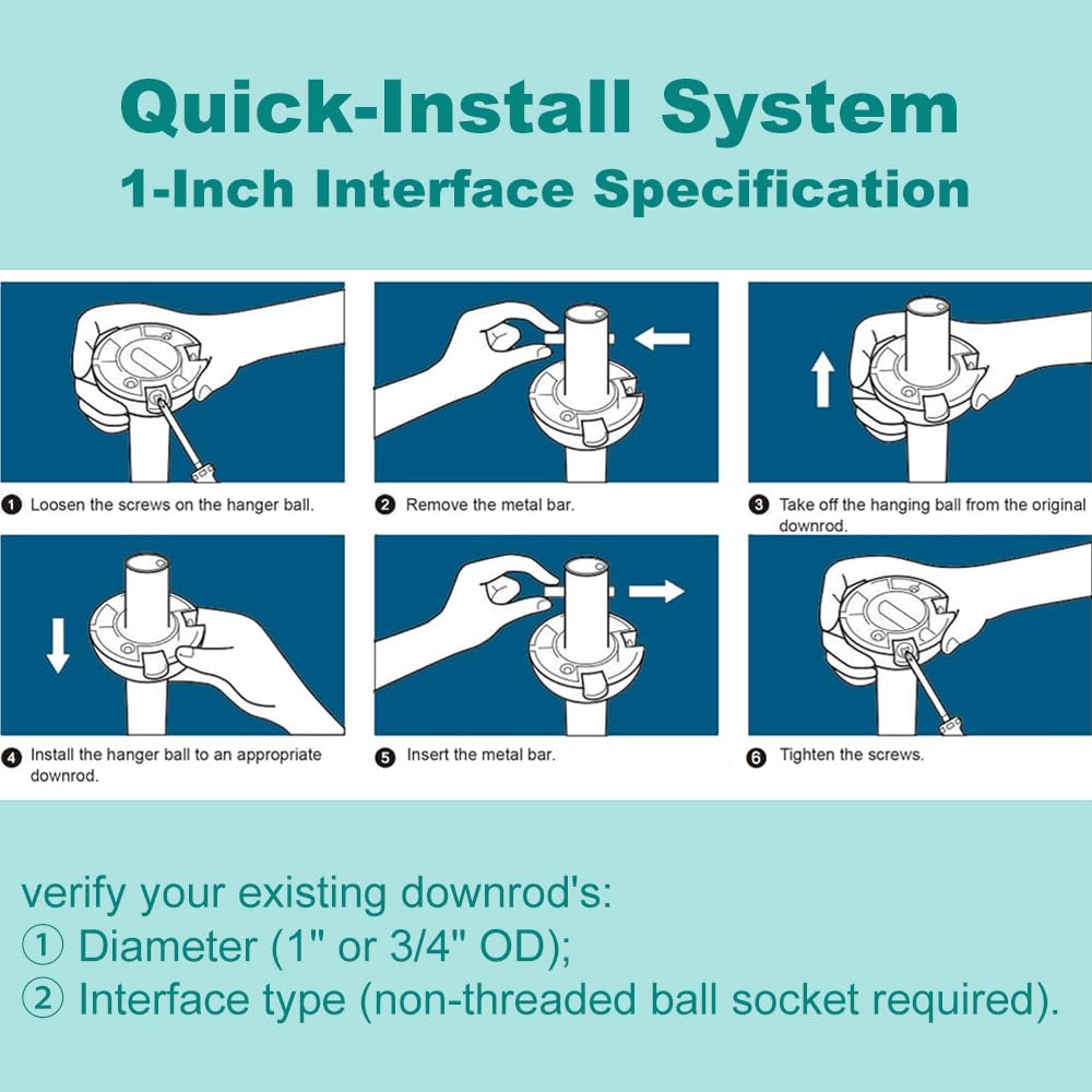 - Quick-Install System - Our extension rod includes a complete installation kit (pre-assembled hanger ball,grounding wire,and locking pins) for tool-free assembly.Simply verify your existing downrod's:① Diameter (1" or 3/4" OD);② Interface type (non-threaded ball socket required).
