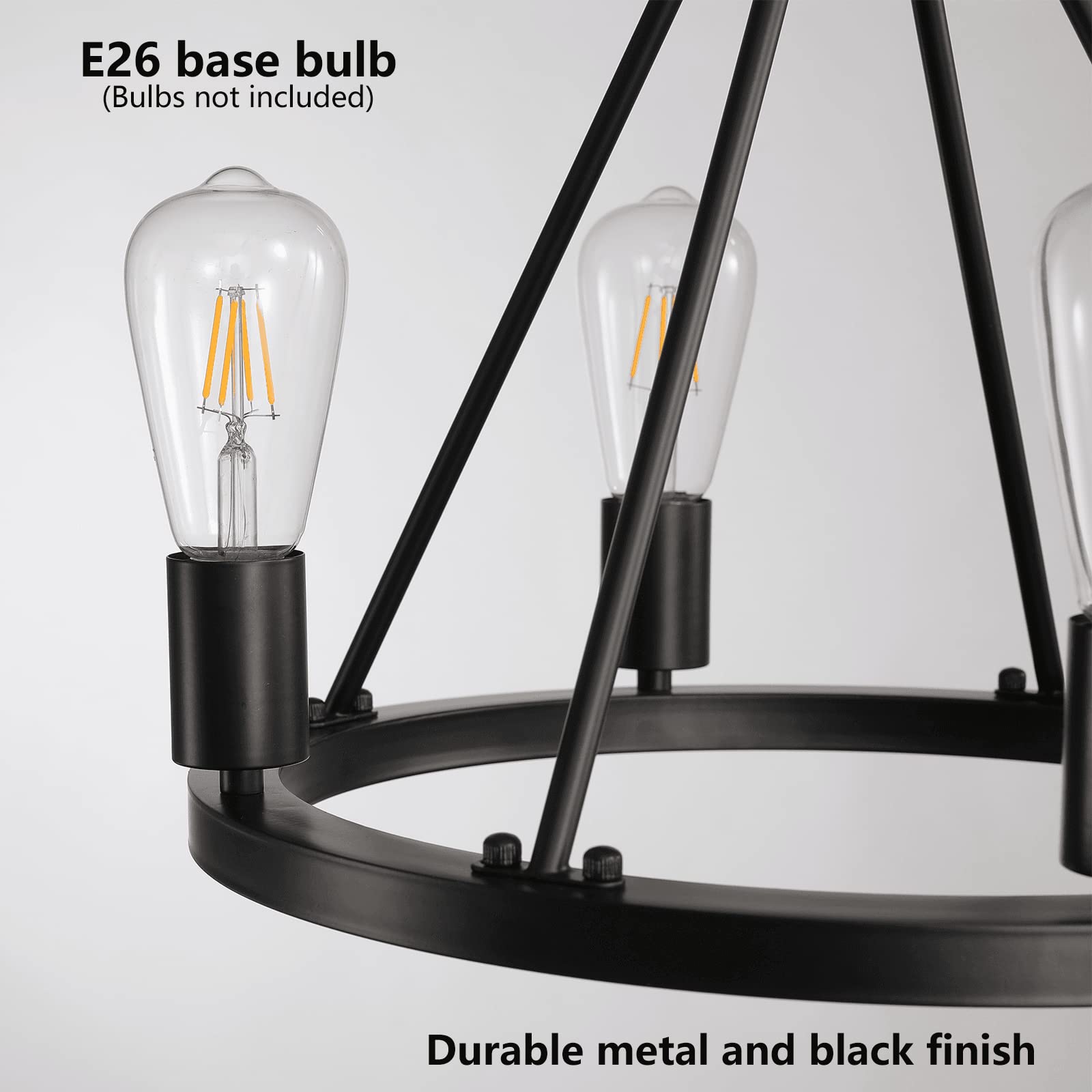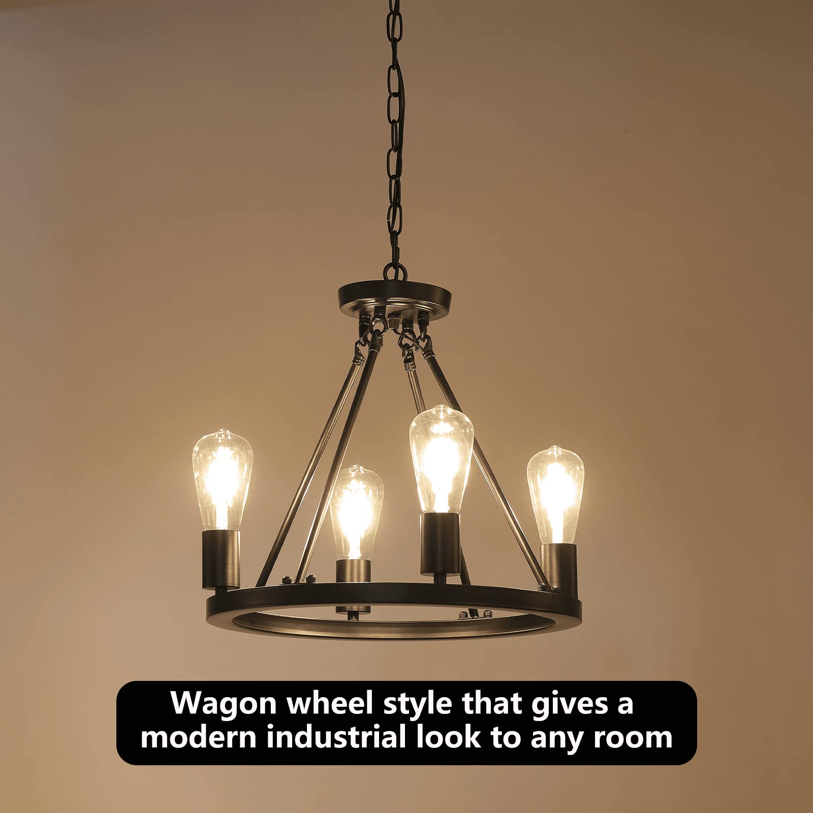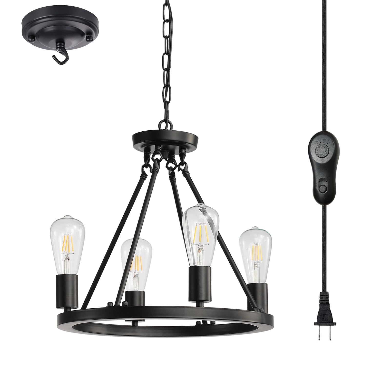 - 【Wagon Wheel Style】This 4-light plug in chandelier features a traditional wagon wheel design with a sleek silhouette that gives a modern industrial look to any room. It has a black metal round frame for some industrial style, and it showcases 4 bulb bases that holds ten separate 60W bulbs (Not Included), Four angled rods connect the round frame to a central point for plenty of support.