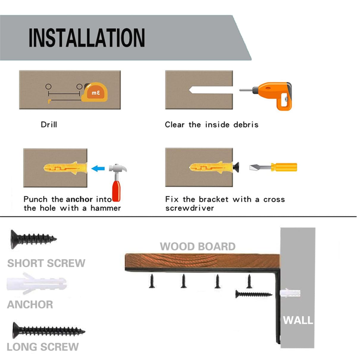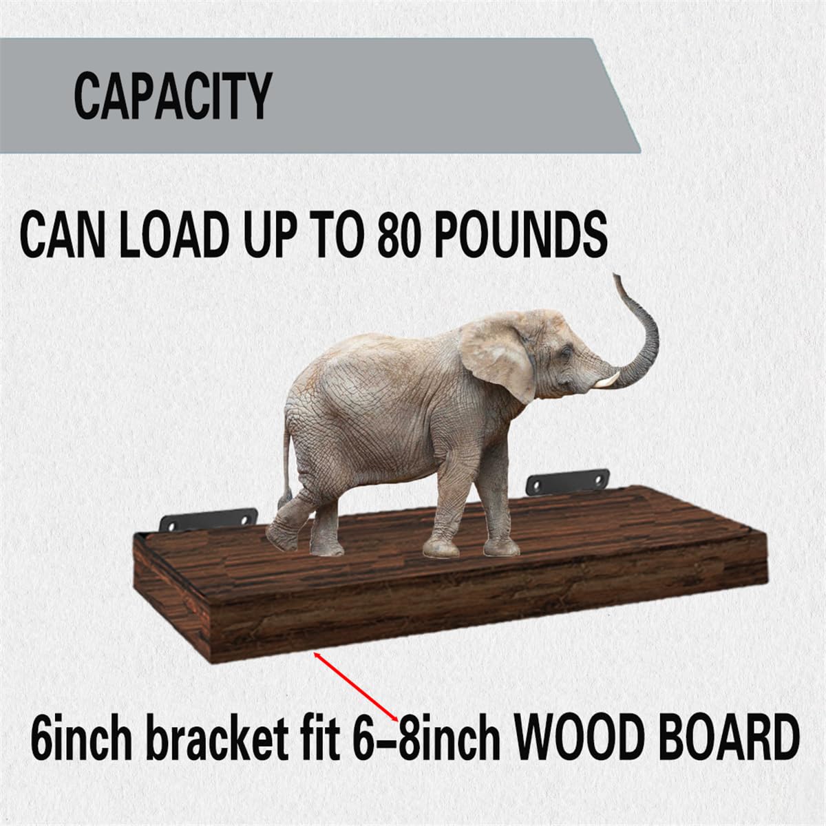 - 【EASY TO INSTALL】:The wall shelf bracket is 6 inches long and 0.1 inch thickness,fit for wooden boards below 8 inches.The package includes 4 brackets,8 short screws,8 long screws,8 concrete anchors and 8 dry wall anchors.The max weight capacity of this shelf bracket is about 80 pounds.