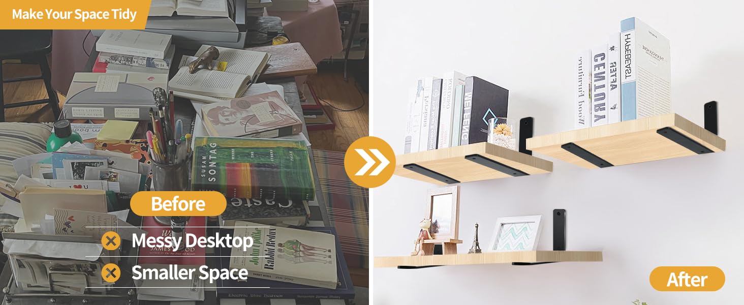 - Maximize space: These floating metal wall shelf brackets will help you make the most of your space,Easy to install design using basic DIY tools. Easily mount your favorite shelves in your garage, home, office, bathroom, kitchen, living room, dining room, bedroom