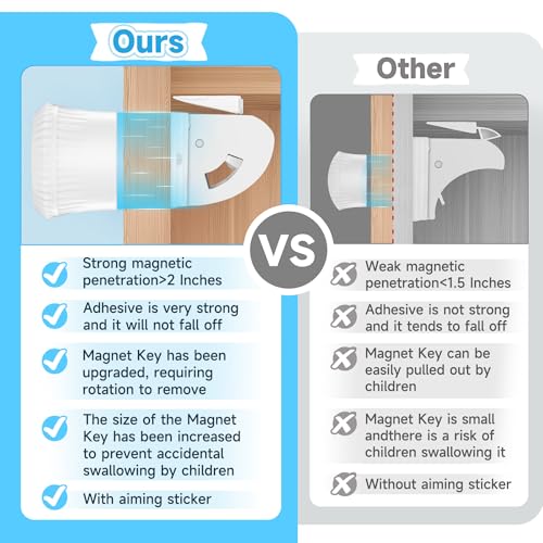- Powerful Magnetic Lock: Unlike some magnetic locks that only work on cabinet doors between 1.2 - 1.5 inches, our safety-first cabinet locks have increased the magnetic strength, with a maximum distance of 2 inches, making it suitable for a wider range of applications. Note that this magnetic drawer lock is not suitable for metal doors