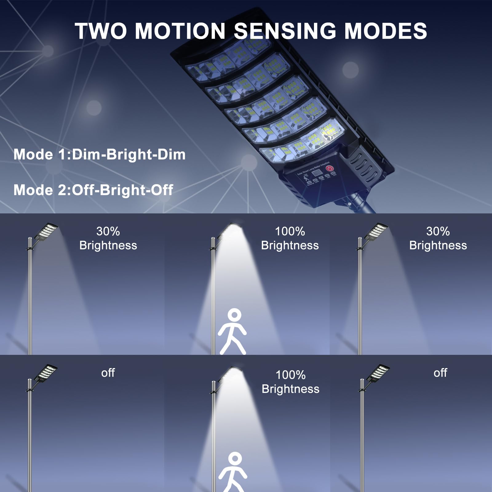 - [4 Lighting Modes] 1) Motion Sensor 1- Bright light when motion is detected while dim light when no motion; 2) Motion Sensor 2- Bright light when motion is detected while no light when no motion; 3) Auto Mode- Steady lighting for about 5 hours regardless of motions ; 4) Timing Mode-Steady lighting for 3/4/5 hours regardless of motions