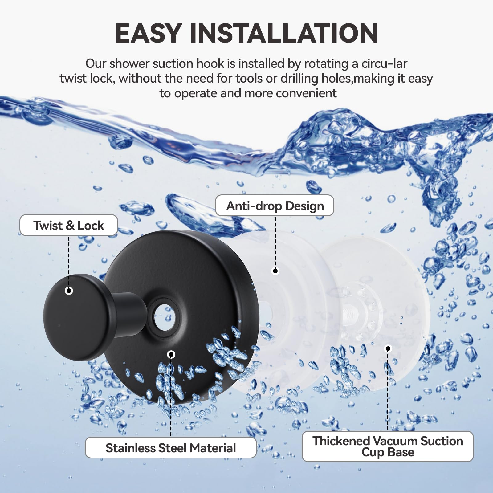 - NO-HOLE INSTALLATION: Suction cup hooks for shower adopts a tool-less, no-drill easy installation to avoid wall damage, simple and removable for reuse, and the can be used in conjunction with any other bathroom accessories. NOTE: When installing the suction cup base must be pressed to expel air to make the product more stable