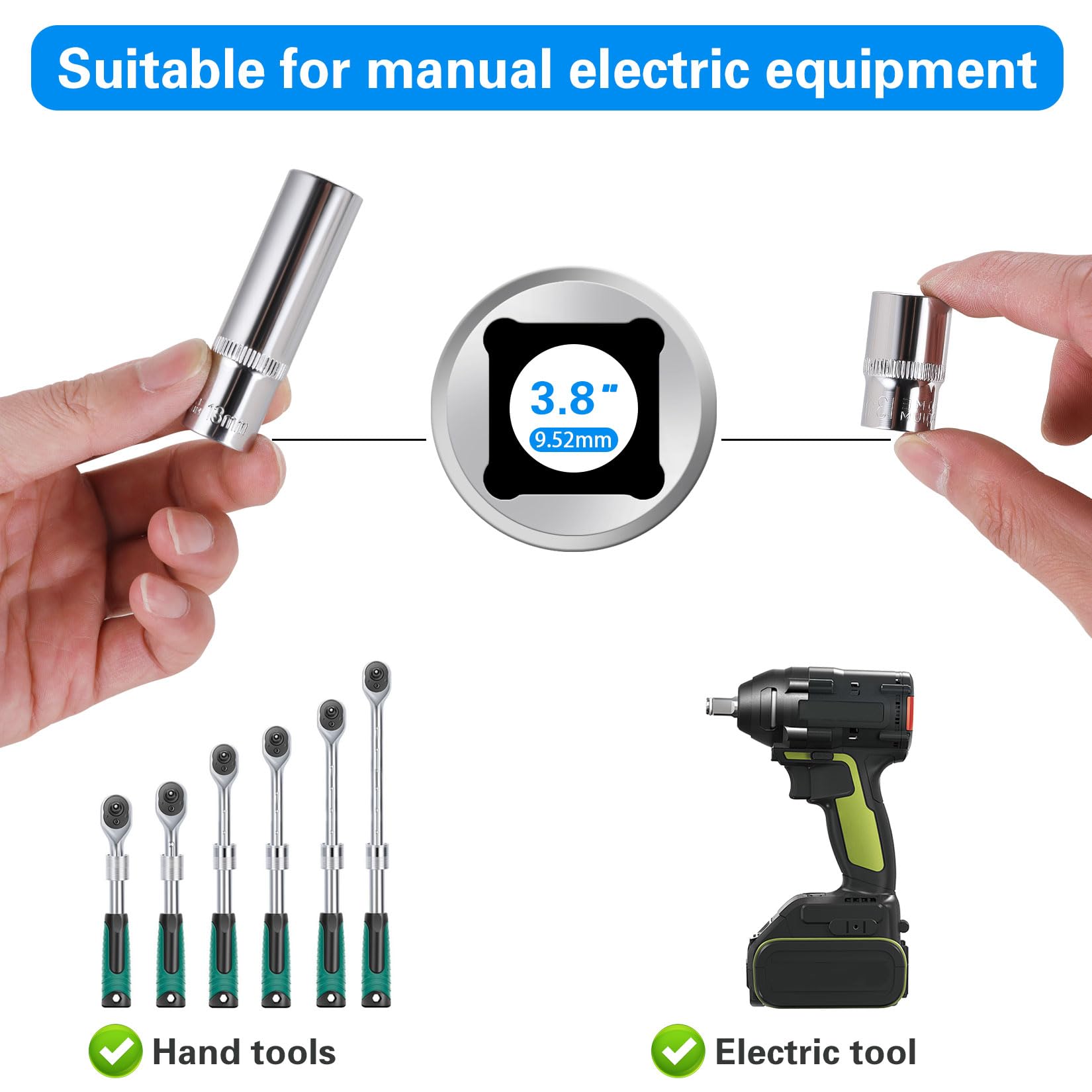 Details: 2 pieces of 6 points 13mm deep sockets and 2 pieces of 13mm shallow sockets with 3/8-inch drive, compatible with standard ratchets and tools.