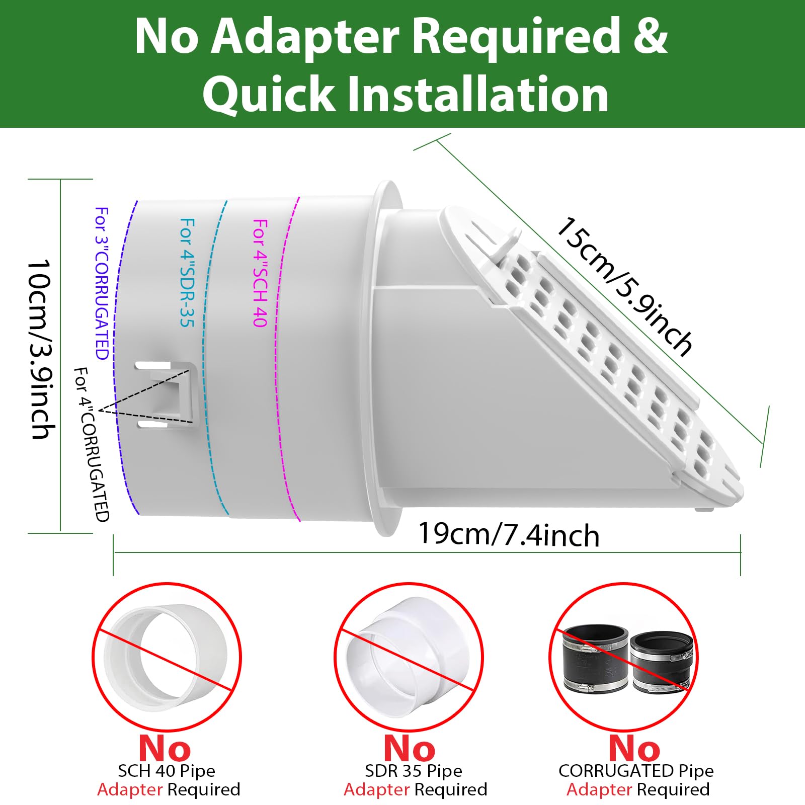 - [Universal Fit for Multiple Pipes]: Manually open the drain cover to fit 4" SCH 40, 4" SDR 35, 4" corrugated, and 3" corrugated pipes. This drainage grate cover offers unmatched versatility—no other drainage grate or yard sewage pump emitter provides such robust compatibility