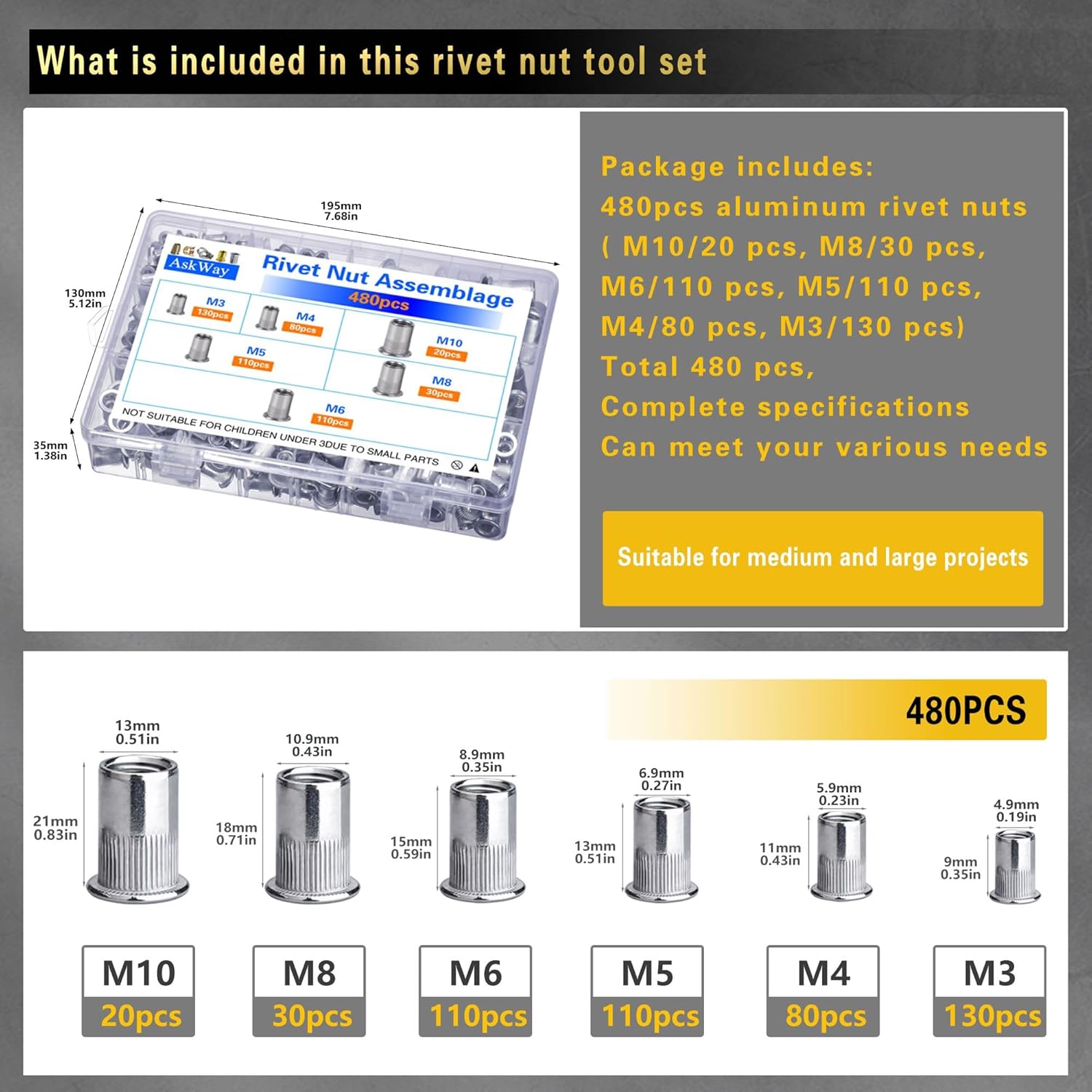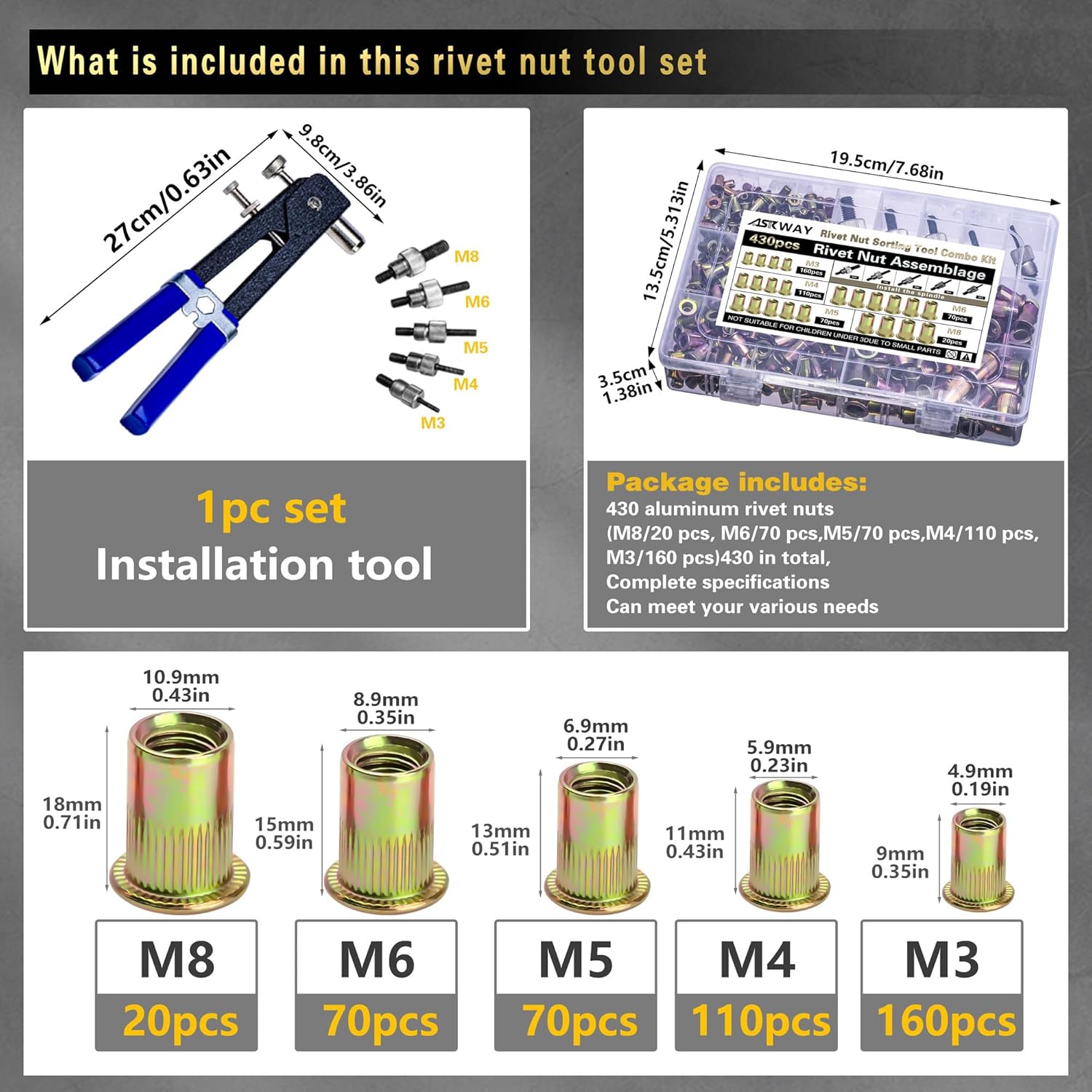 - [About this project]: This rivet nut tool kit includes 1pc set rivet nut installer, which provides 5 metric thread sizes of embedded rivet nuts, including: M3/160 pcs, M4/110 pcs, M5/70pcs, M6/ 70pcs, M8/20pcs, a total of 430pcs of rivet nuts, which can meet your various daily needs.