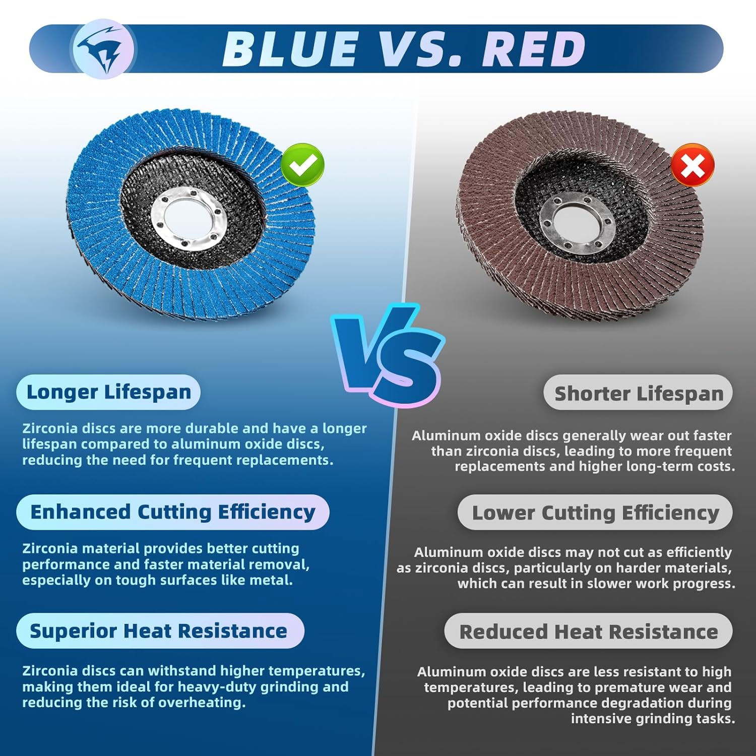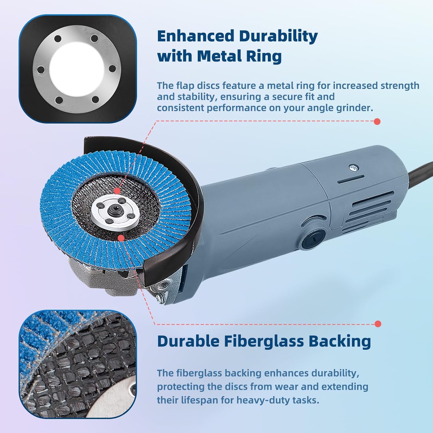 - 【Premium Durability】These flap discs are made from durable zirconia alumina, offering longer life and better performance than standard abrasives. The strong fiberglass backing reduces vibration, providing safer, more efficient grinding. These discs are constructed with premium materials, ensuring durability and longevity, even under high temperatures and pressure.
