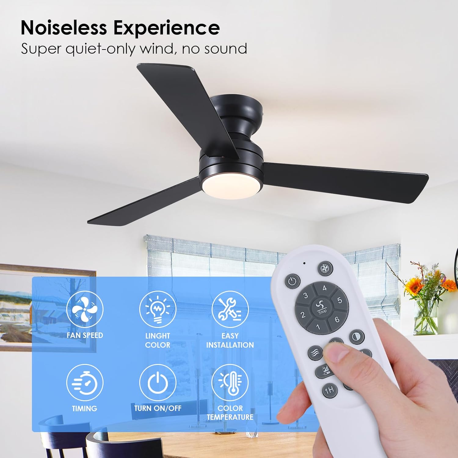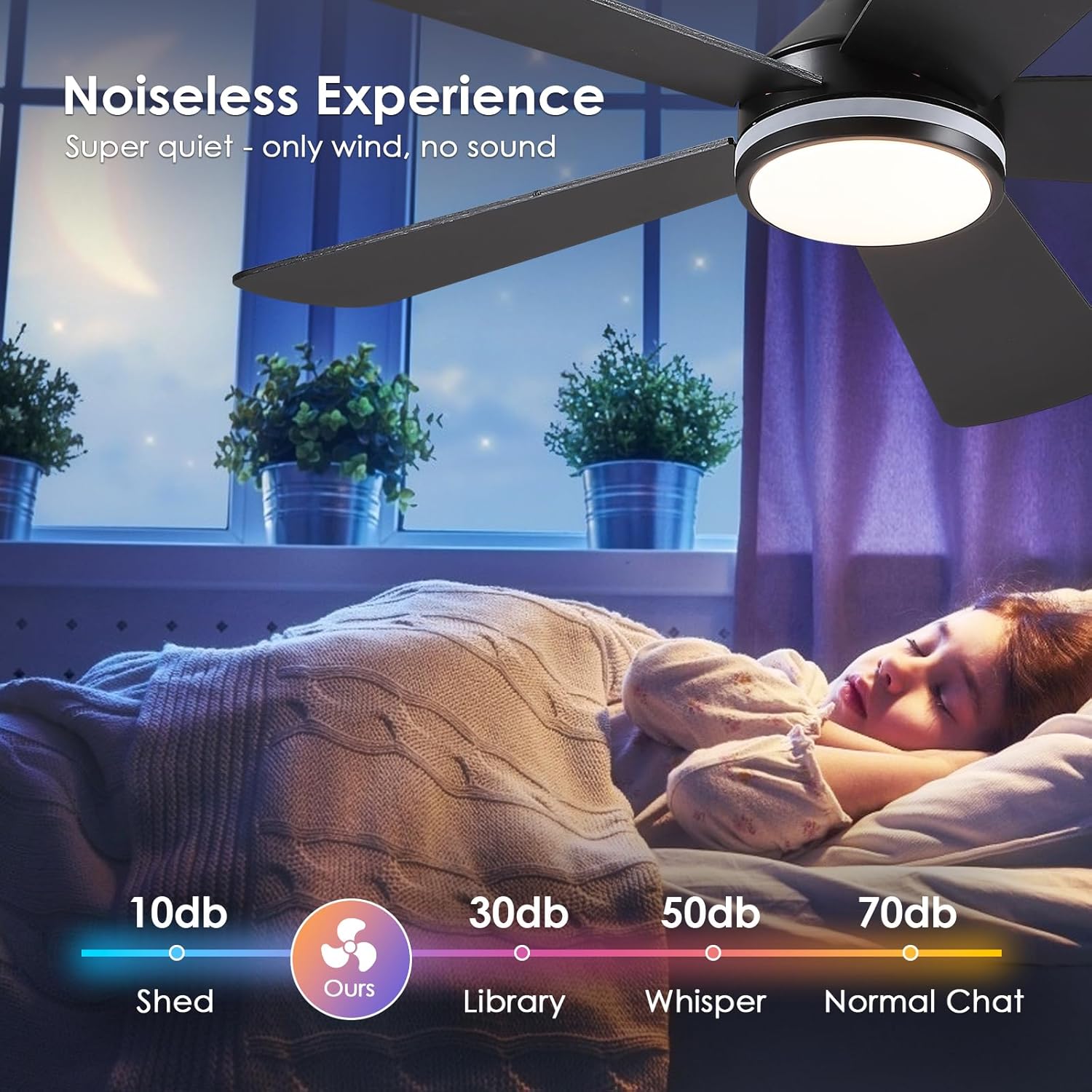 46” Black Low Profile Ceiling Fan with Lights & Remote Control - Dimmable, Noiseless, Reversible for Bedroom