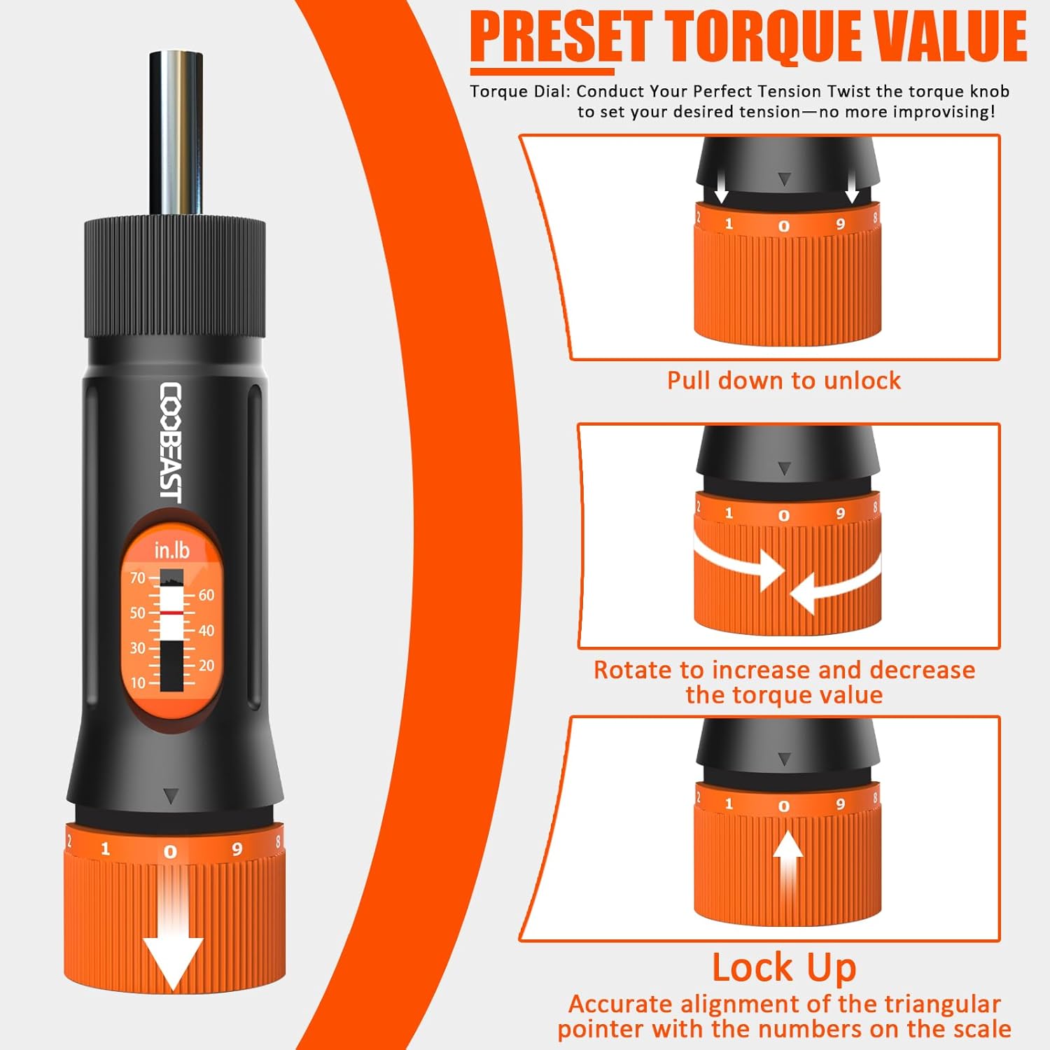 - HIGH ACCURACY SCREWDRIVER - Coobeast preset torque screwdriver offers a torque range of 10-70 in-lbs with a torque increment of 1 in-lbs. Accuracy of +/- 2 in-lbs. Clearly main display screen and scale are easy to read. Strong identification redline alignment scale line combines the bottom subscale value to provide the final value and avoid read errors. High accurate and easy to operate.