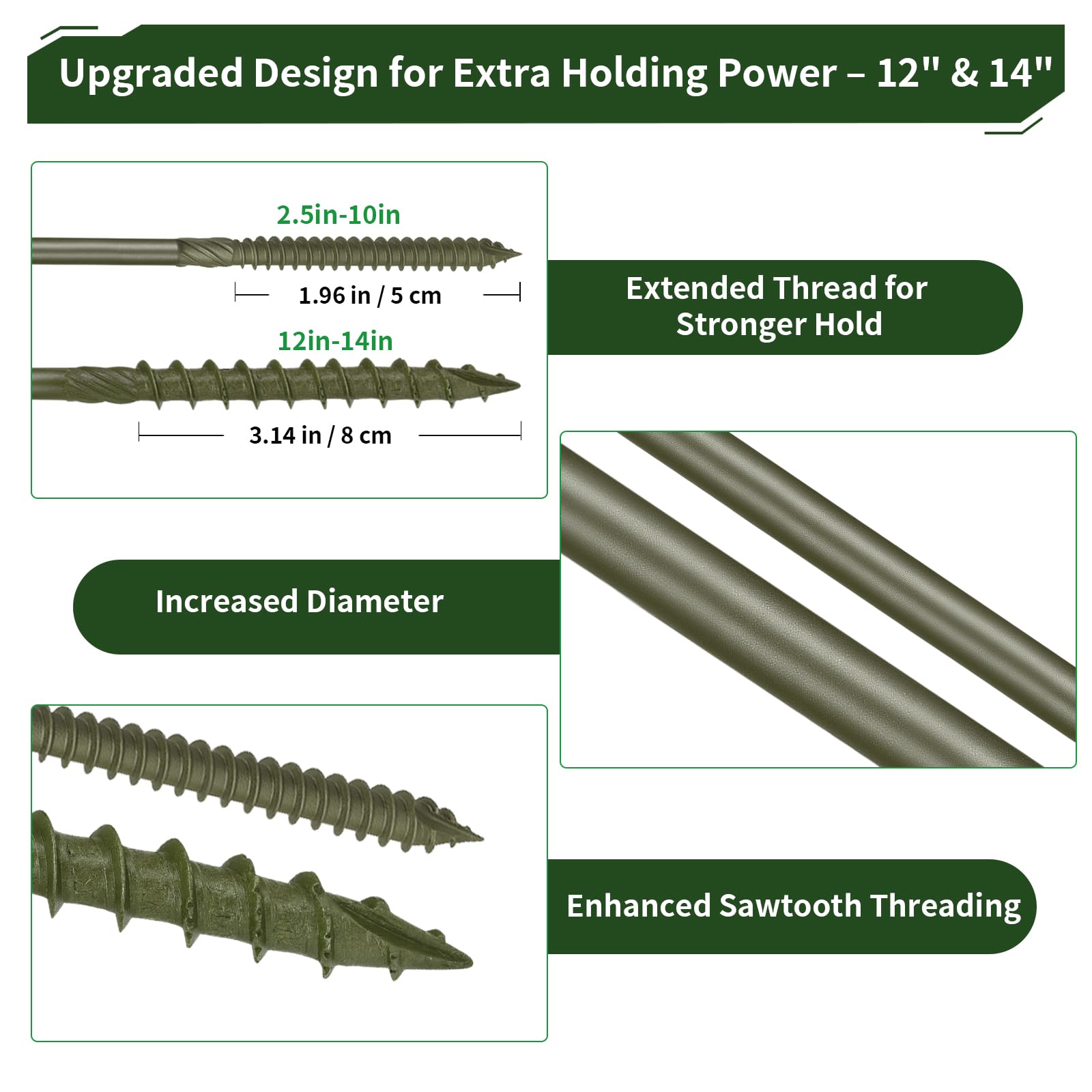 5/16 x 12 inch Long Timber Screws,Heavy Duty Exterior Lag Bolts with Hex Head, Structural Wood Screws for Deck, Fence, Landscape & Gazebo,Rust-Resistant Green Coated, Sample Pack 6pcs