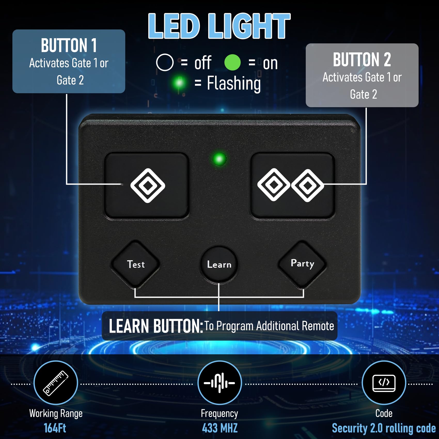 - 【Easy Tool-Free Programming:】 The 5-Button Remote Transmitter includes simple instructions for adding or removing devices—no tools required for setup.