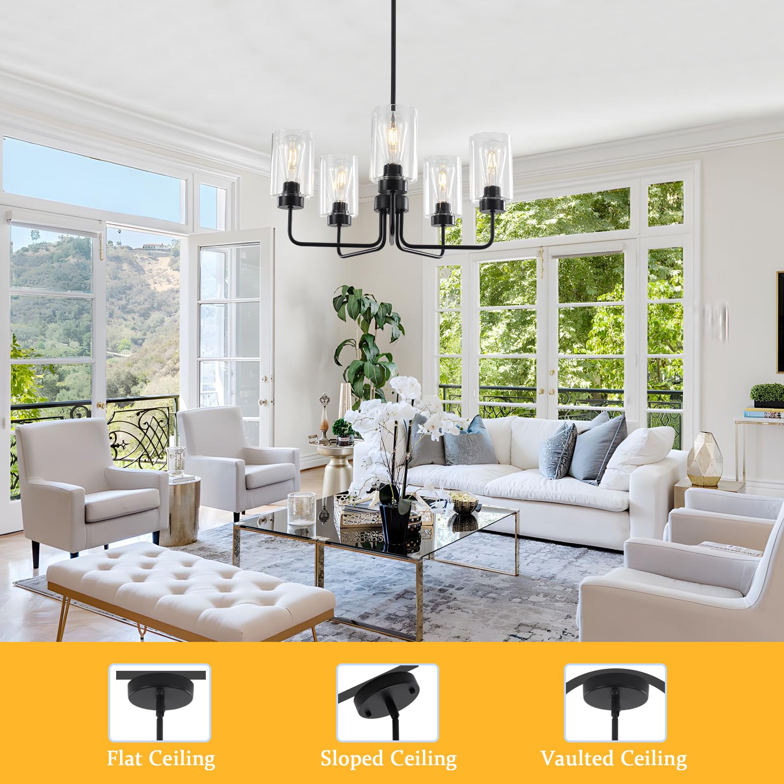 5-Light Modern Farmhouse Black Chandelier for Dining Room, 22" Industrial Pendant Light Fixture with Glass Shades, Adjustable Hanging Ceiling Lamp for Kitchen Island, Living Room, Bedroom, Foyer