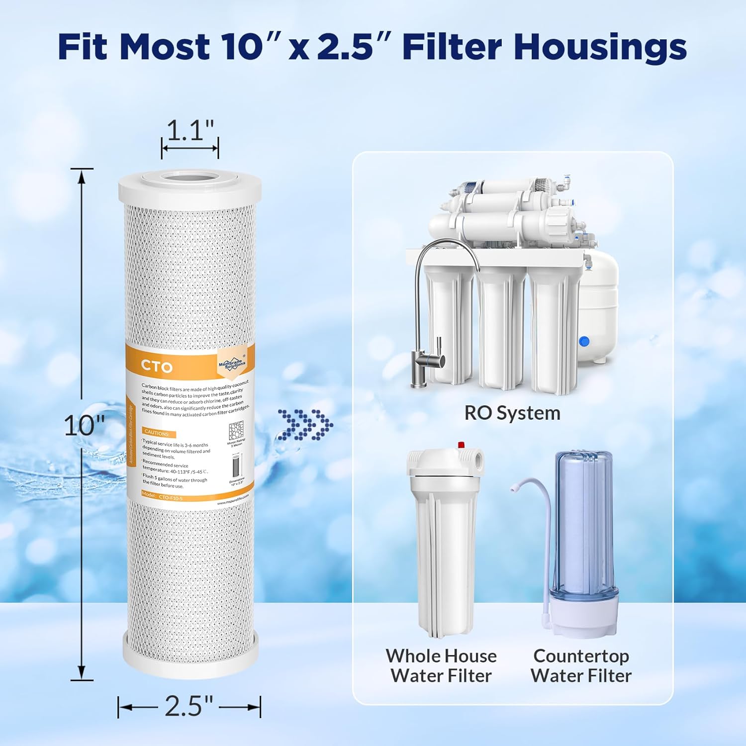 - UNIVERSAL SIZE - The standard 5 micron 10" x 2.5" CTO carbon filter is suitable for most standard Reverse Osmosis System, Under Sink Filtration System, Countertop Drinking Water Filter, RV Water Filtration, Catchment system and whole house filtration system with standard 10-inch housing.