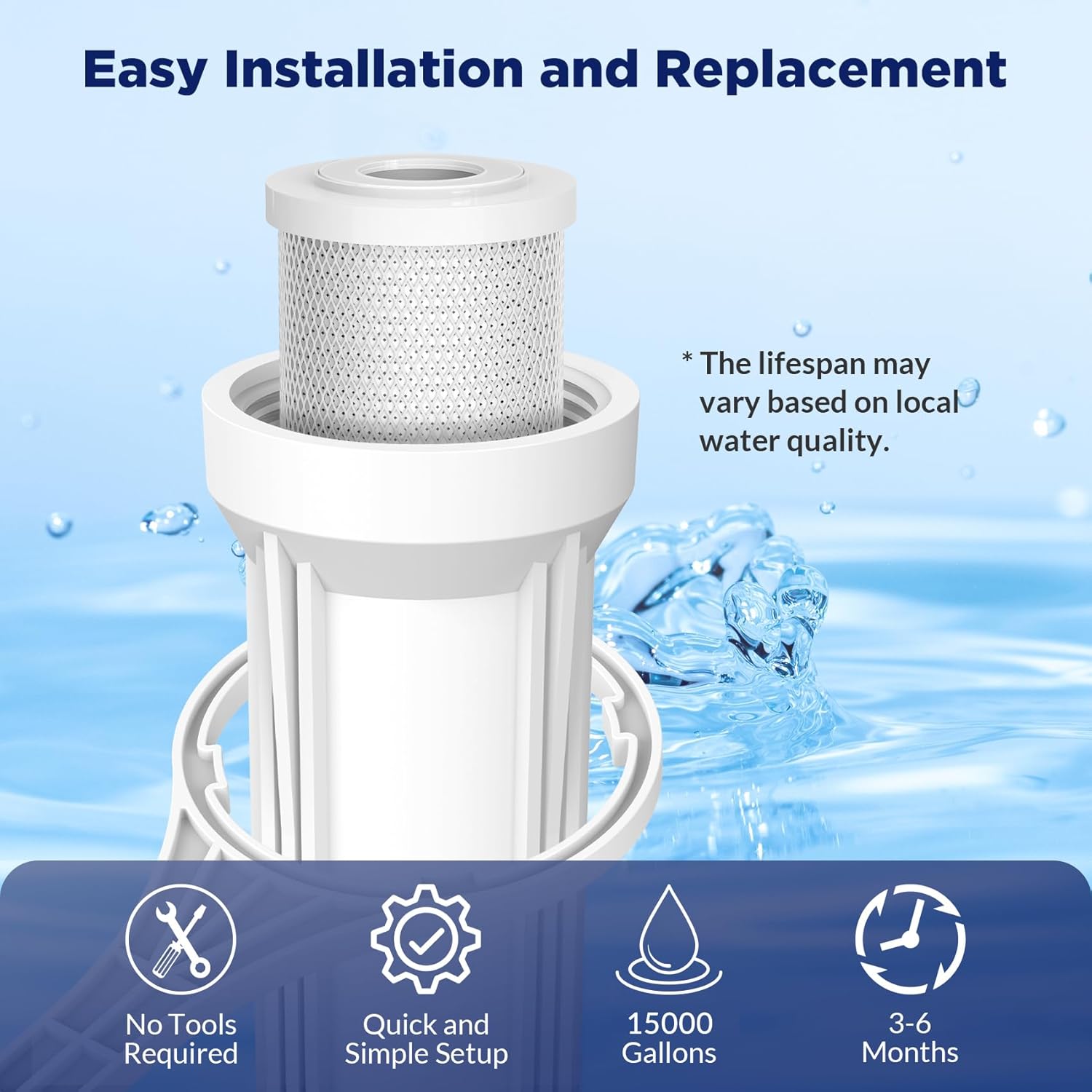 - LONG LIFETIME - 5 micron carbon filter has a long life span of up to 15,000 gallons. We recommend that it be replaced every 3-6 months (it also depends on your water quality) so that you could have a wonderful and enjoyable water experience.