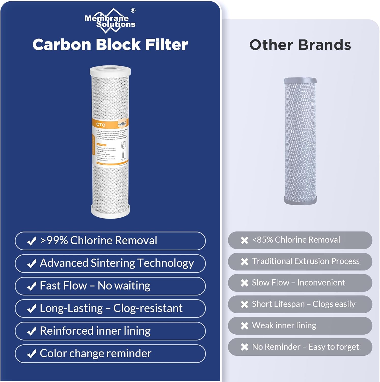 - EFFICIENT AND RELIABLE FILTRATION - Our CTO carbon filter has strong adsorption capacity. It can not only filter up to 99% of sediment, rust, silt, sand, iron, and other undissolved particulates, but also reduce the chlorine, odors to improve the water taste and quality.
