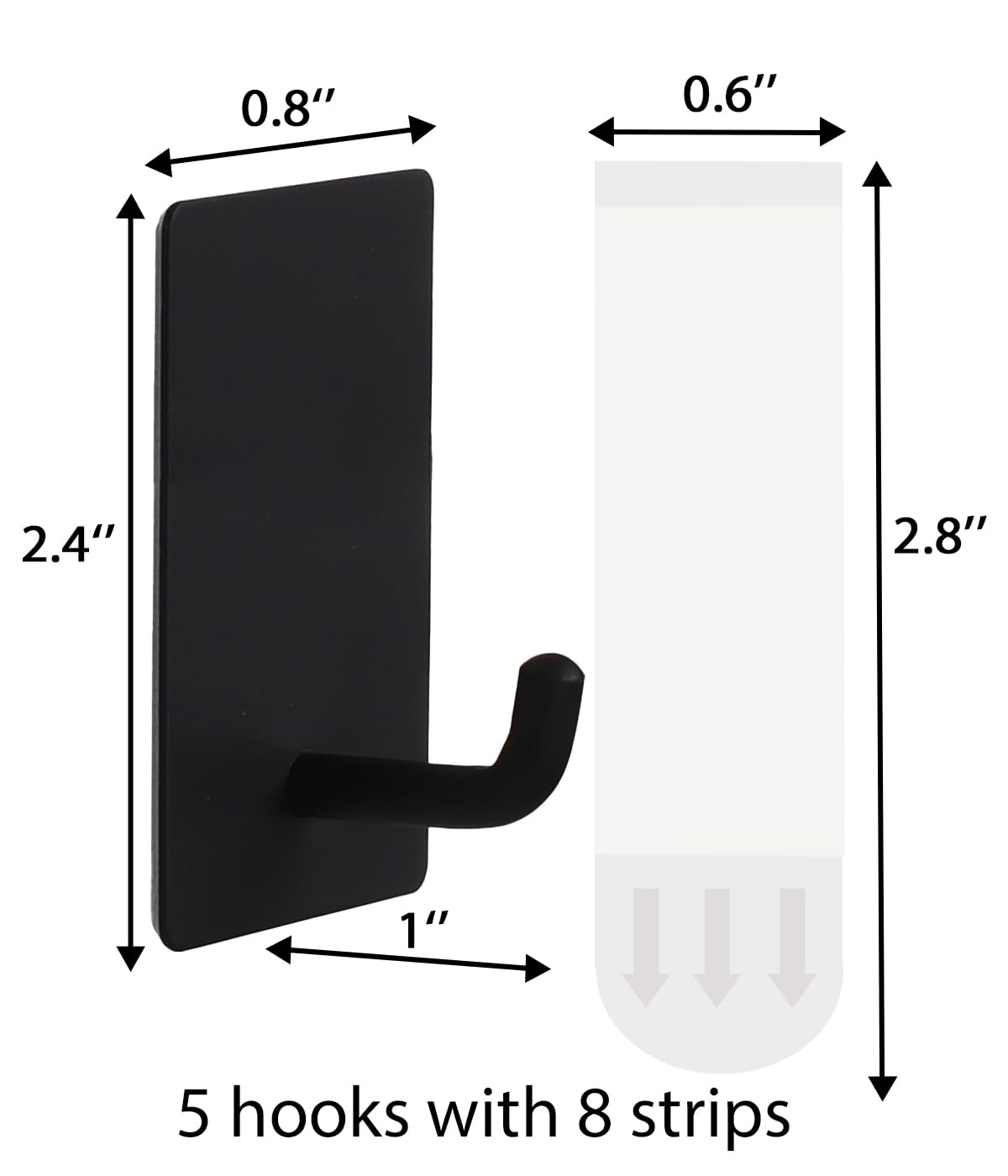 5 Pcs Towel Hooks with Removable Strips for Hanging,Adhesive Wall Hooks Heavy Duty,Outdoor Hooks No Damage,Sticky Hooks for Bathrooms,Shower,Stockings,Decor,Robe,Medium,Black 304 Stainless Steel