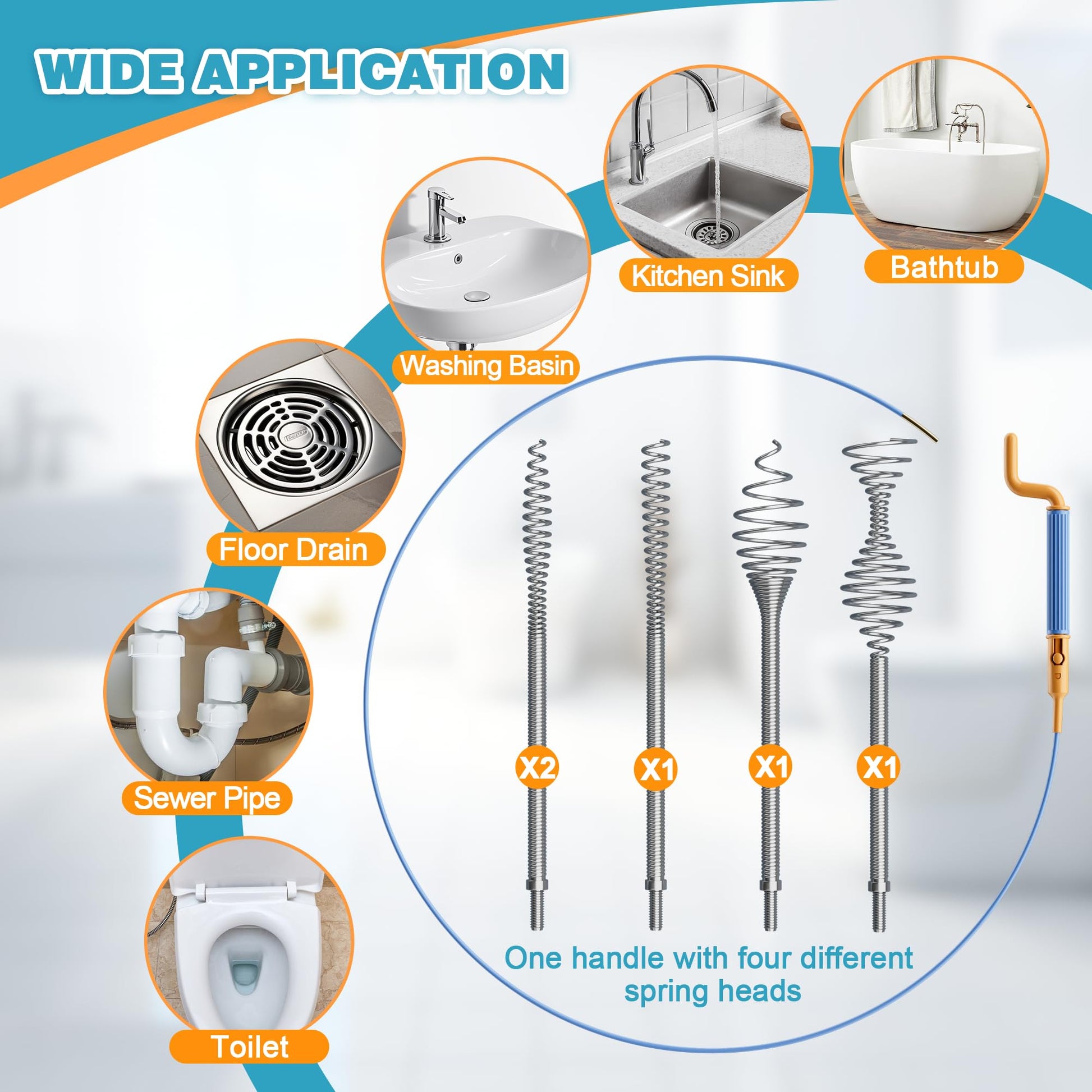 - Widely Application: The spring heads flexibly bends to fit all pipe types, effectively clearing clogs in bathrooms, sinks, showers, bathtubs, and floor drains. Effortlessly removes hair and debris for fast, mess-free cleaning, saving time and energy