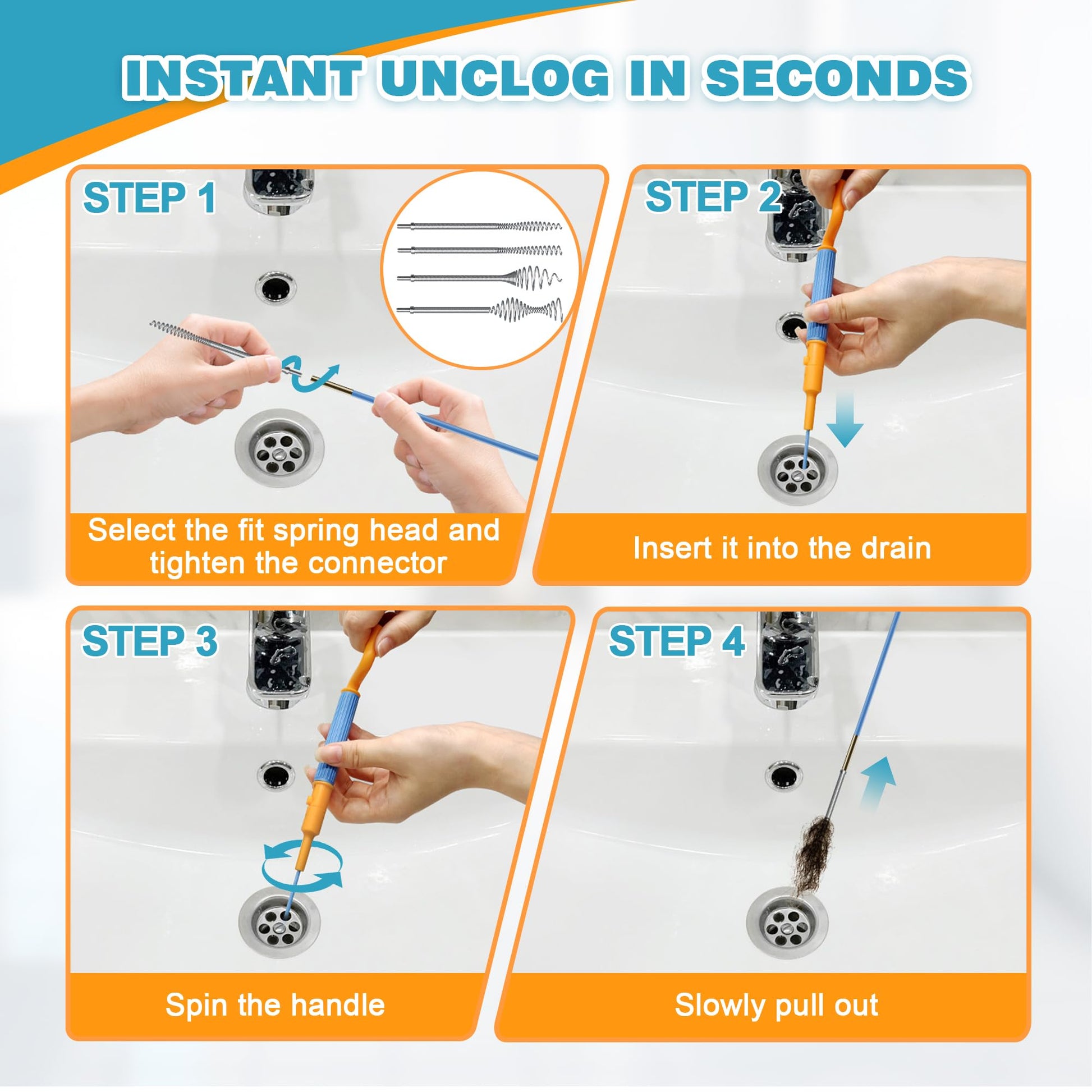 - Versatile & Reusable Spring Heads: Includes 4 different sizes for targeted clearing of various blockages and fitting various pipe openings. Effortlessly connect or remove the spring heads for convenient operation. effortless to clean leftover hair after use, rinse for reuse
