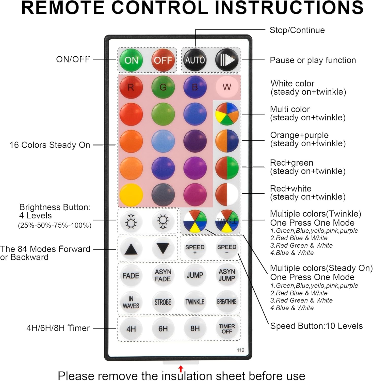 - Remote Control : Use the included 32-button wireless remote control to easily select different colors, choose from 8 lighting modes for each color, adjust speed and brightness, and set a timer (4/6/8 hours). Our user-friendly remote control is designed to be clear, intuitive and eye-catching. To use the remote control, remove the insulating tab in the remote control and align it with the controller box.