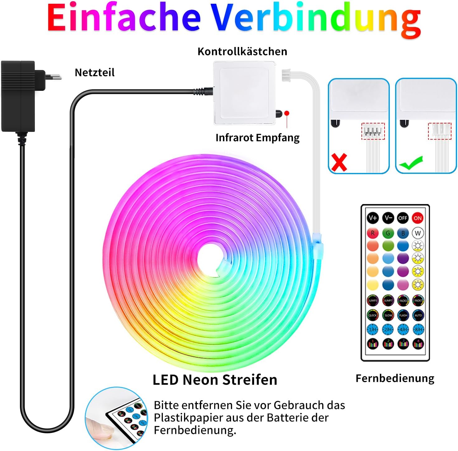 - LED Neon Light Bar Set: 1) 1x 50ft LED Neon strip Lights 2) 1x 24V1A Power Supply 45x Snap 45 Screws 1x Controller 1x Remote Control