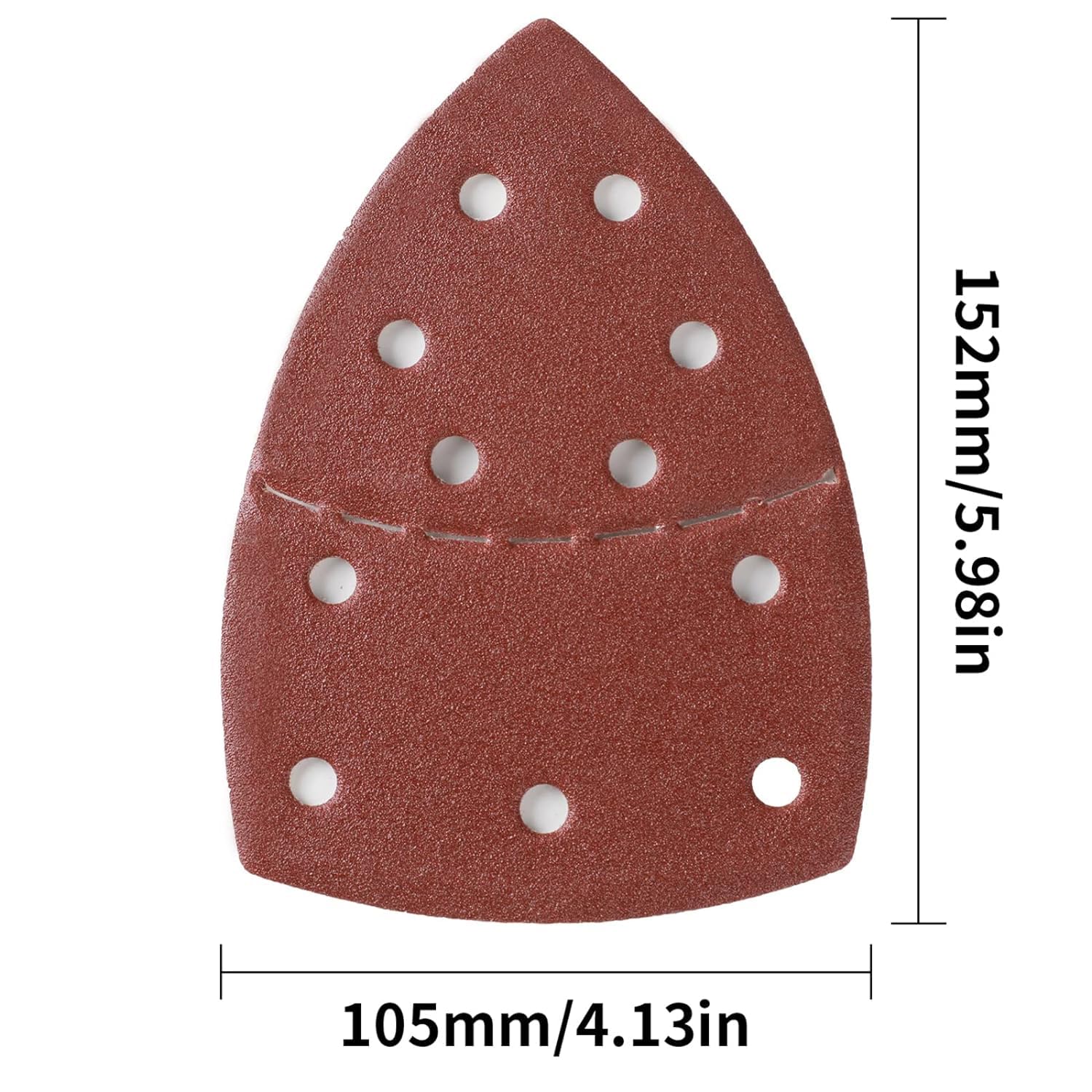 - Size: Measuring 6x4 inch (152 x 152 x 105mm), these pre-punched sandpaper sheets are compatible with most palm sanders of this size. The serrated edges allow for easy splitting into two halves, with 11 holes for efficient dust removal and quick attachment.
