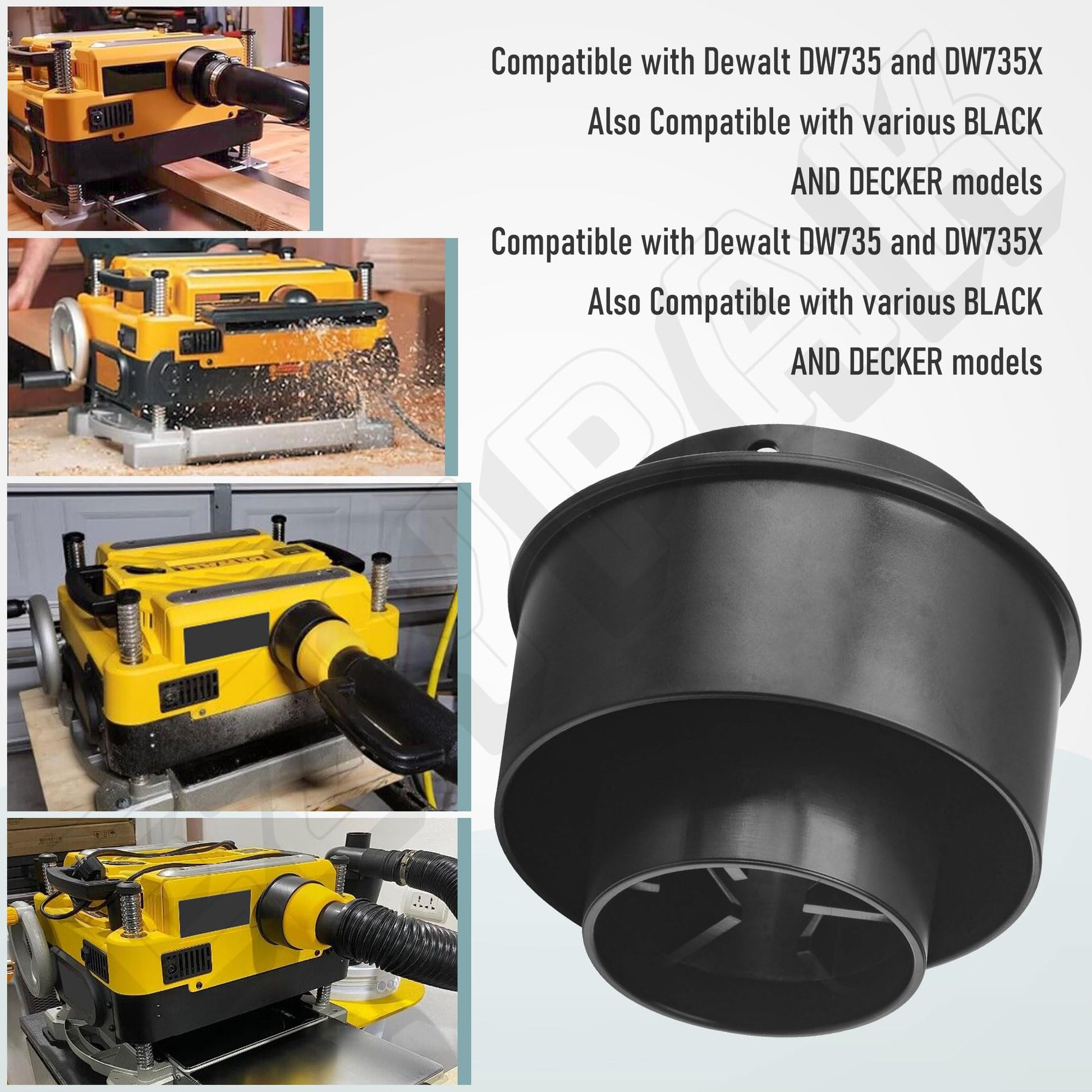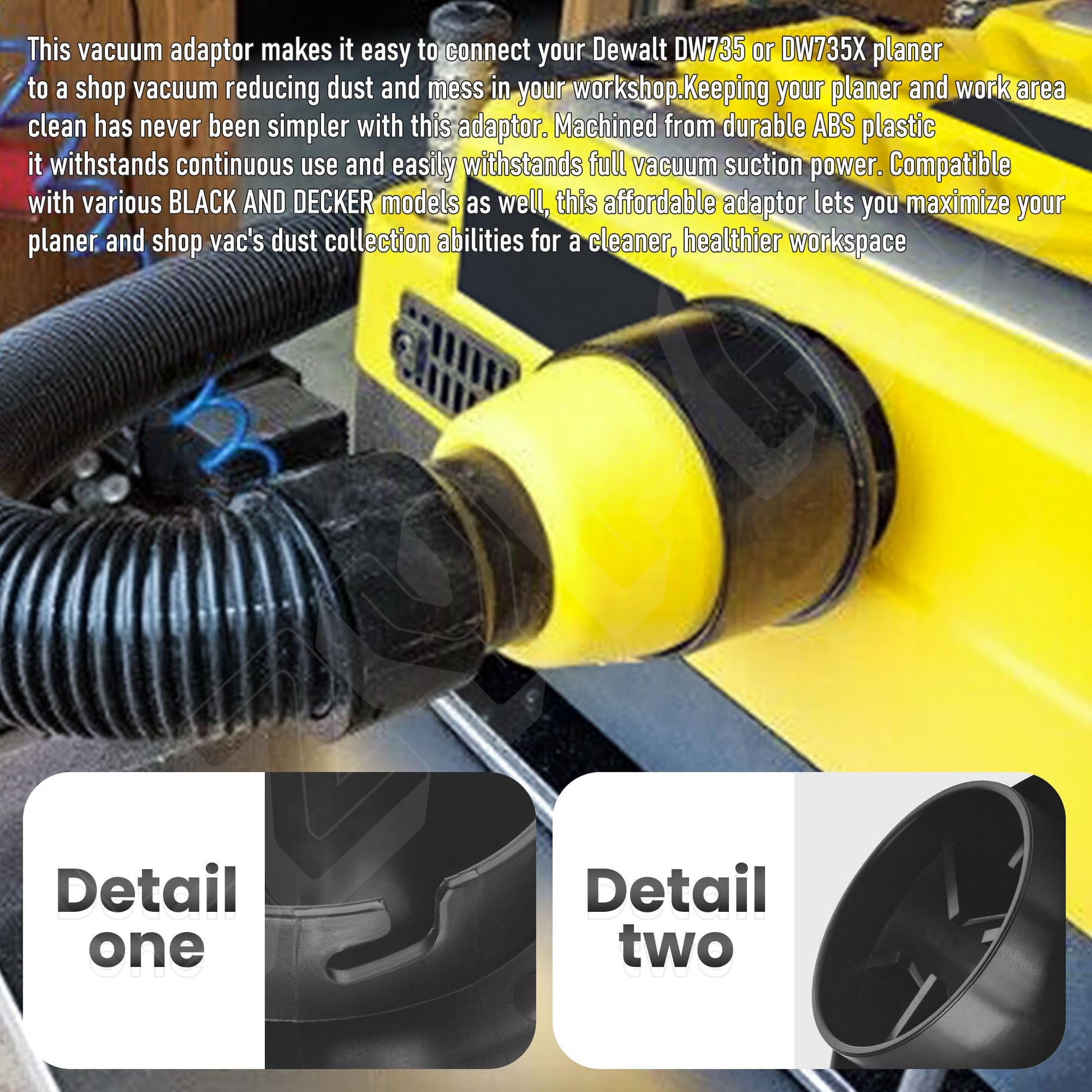 - This vacuum adaptor makes it easy to connect your Dewalt DW735 or DW735X planer to a shop vacuum, reducing dust and mess in your workshop.Keeping your planer and work area clean has never been simpler with this adaptor. Machined from durable ABS plastic, it withstands continuous use and easily withstands full vacuum suction power. Compatible with various BLACK AND DECKER models as well, this affordable adaptor lets you maximize your planer and shop vac's dust collection abilities for a cleaner, healthier workspace