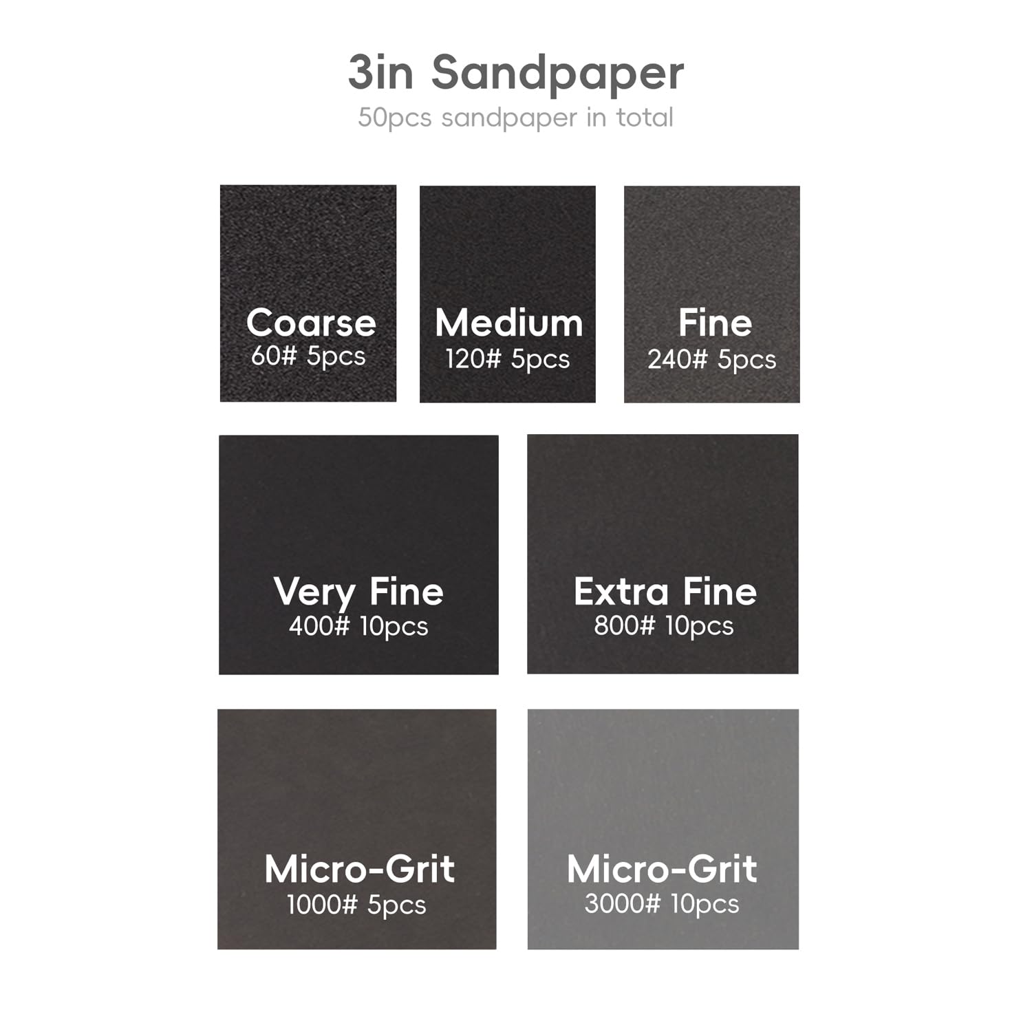 - All-in-One Polishing Kit – Includes 7 types of 3-inch round sandpapers (60/100/180/320/600/1500/3000 grits) for a full range of sanding and finishing tasks, from rough grinding to fine polishing.