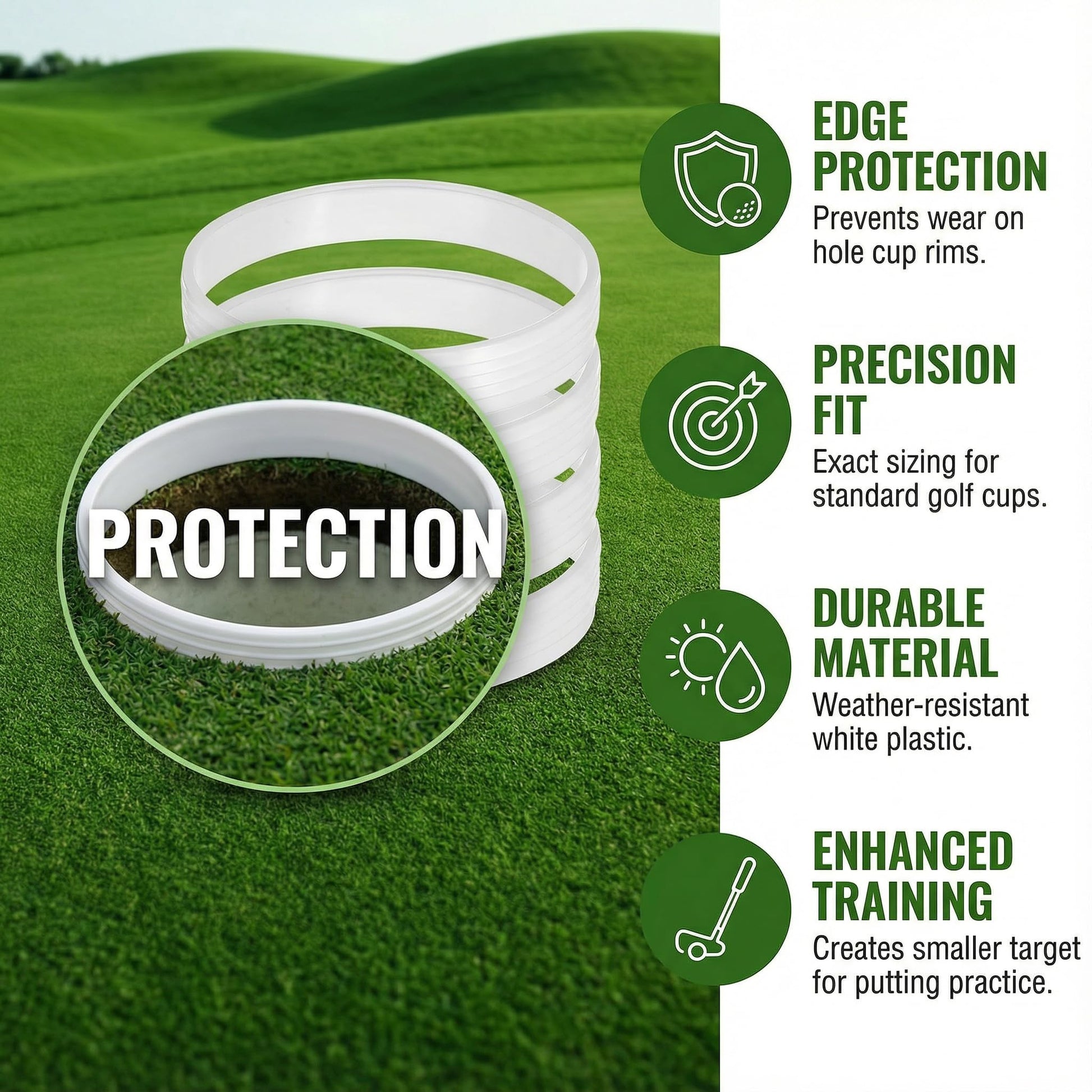 - Golf hole cups feature a bright white color and smooth finish, and are designed to keep your cup dry and clean easier than other golf hole cups