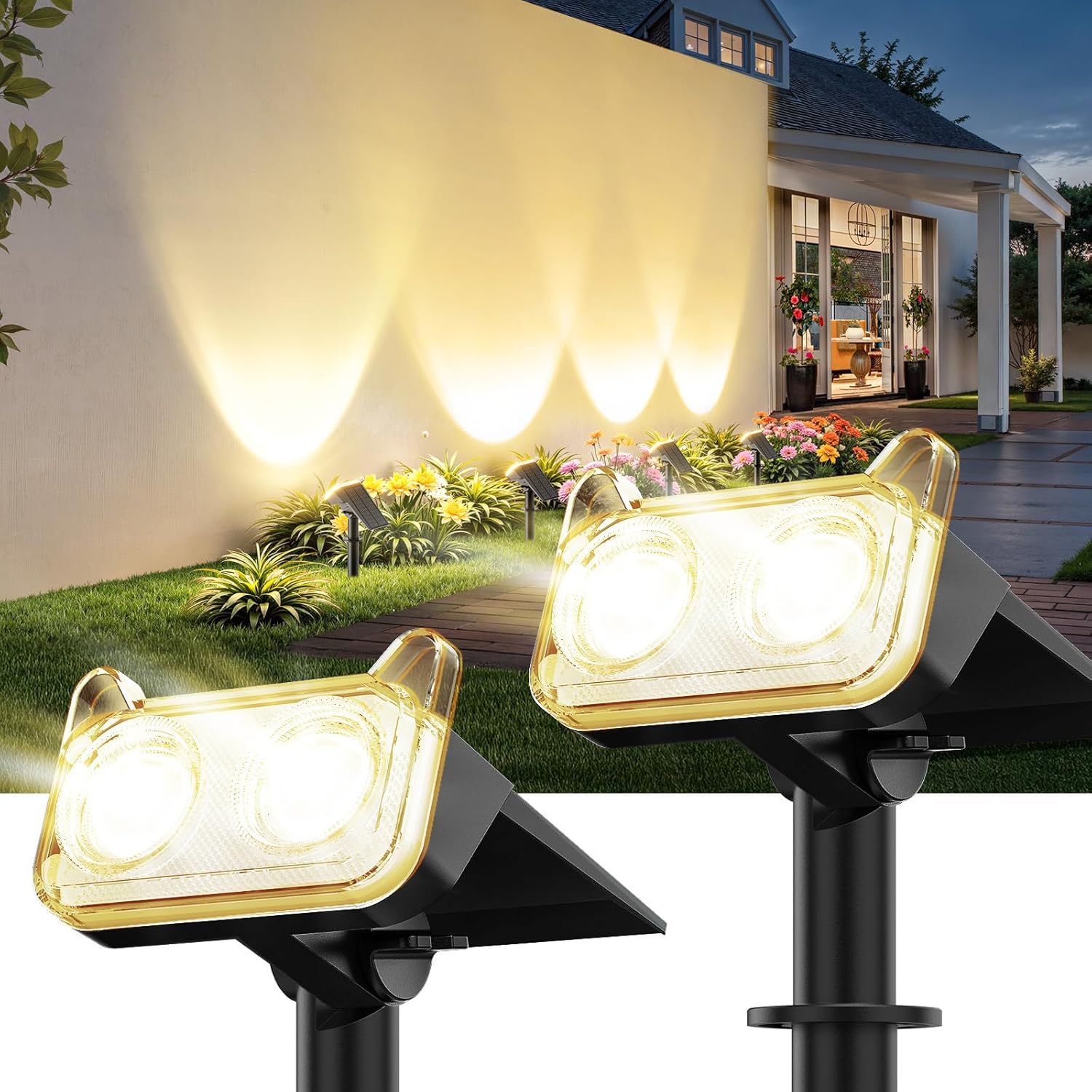- Wide Application & 2-IN-1 DESIGN: Solar garden lights outdoor are perfect for garden, pathway, driveway, and more. With two installation options — ground stake for easy placement in soil and wall mounting for flexibility — solar landscape lights provide a hassle-free setup. Whether you’re lighting up tree, sculpture, or driveway, solar spotlights are a fantastic way to enhance your outdoor space. Reliable and efficient, outdoor spot lights for yard bring both beauty and function to your home