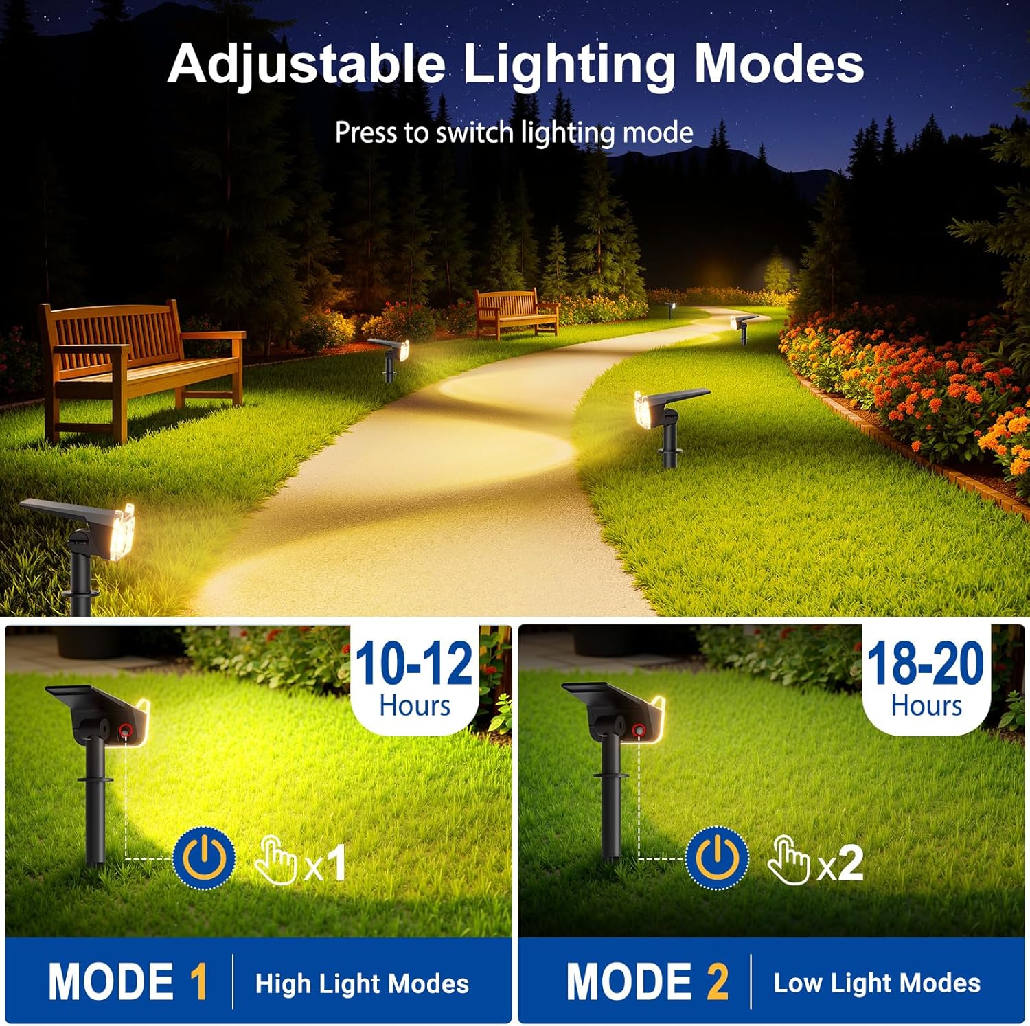 - Brighter Focusing LED & Long Lasting: Equipped with two high-power LED and upgraded optical convex lenses, solar spot lights outdoor provide brighter, more focused light. Solar lights outdoor feature a 1200mAh high-capacity battery for long-lasting performance. In high light mode, solar spotlight offer up to 12 hours of continuous illumination, while low light mode extends this to 20 hours. Whether lighting up your garden or yard, solar outdoor lights ensure reliable, long-term outdoor use
